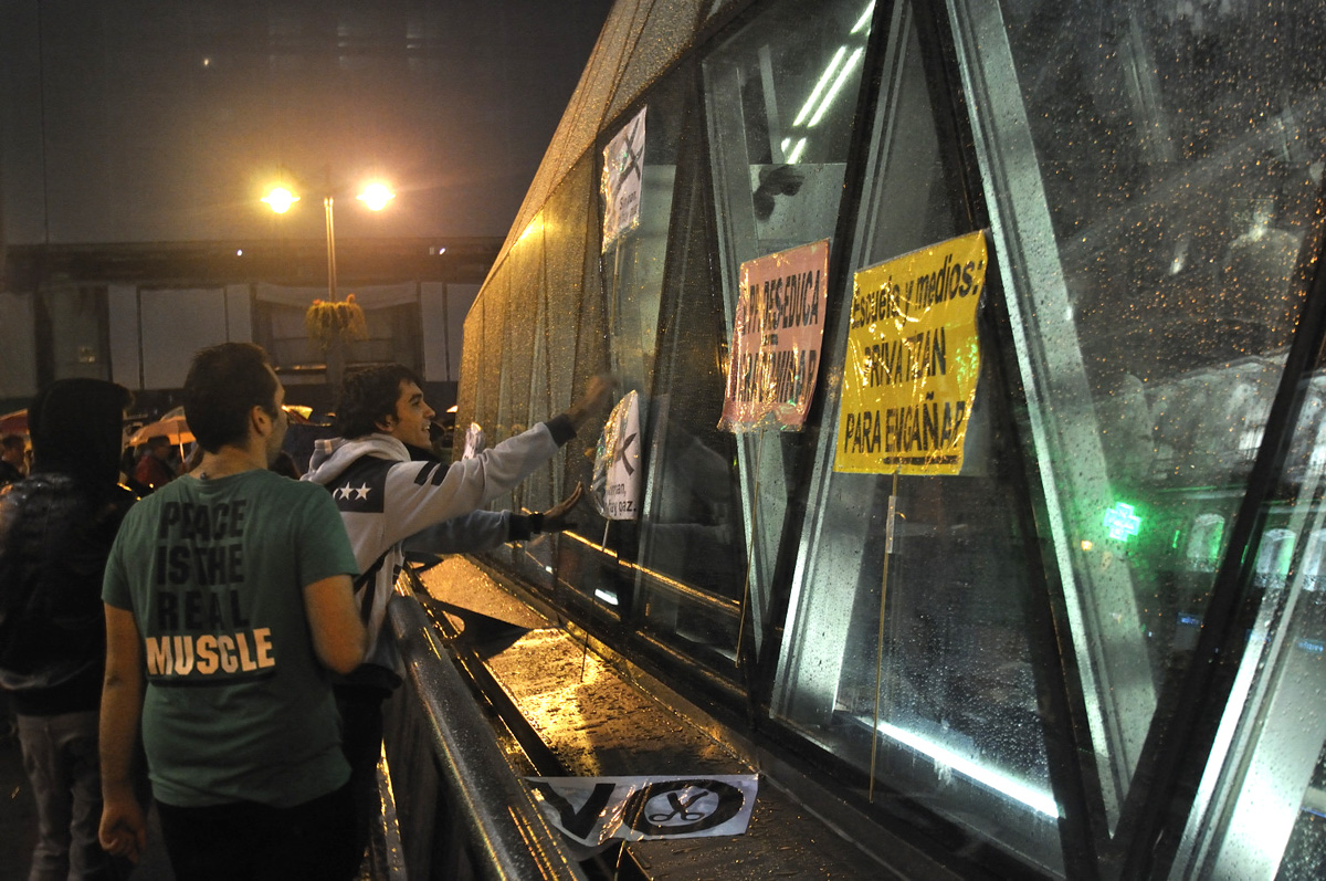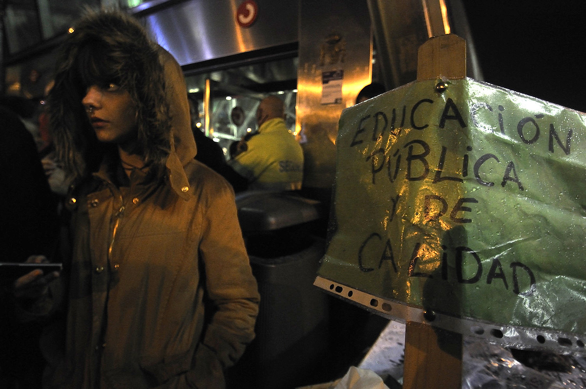 "Educación pública y de calidad" se lee en la pancarta improvisada de esta jóven, que espera mientras consulta su móvil.