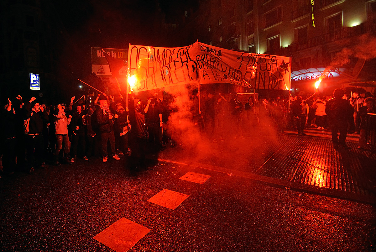 Al finalizar la lectura de un manifiesto un grupo de jóvenes encendieron antorchas al mismo tiempo que levantaban una pancarta reivindicativa.