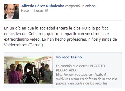 El líder del PSOE, Alfredo Pérez Rubalcaba, publicó este jueves en su cuenta de Facebook un vídeo a cuenta de la huelga educativa. "En un día en que la sociedad entera le dice NO a la política educativa del Gobierno, quiero compartir con vosotros este extraordinario video. Lo han hecho profesores, niños y niñas de Valderrobres (Teruel)", comentaba el socialista.