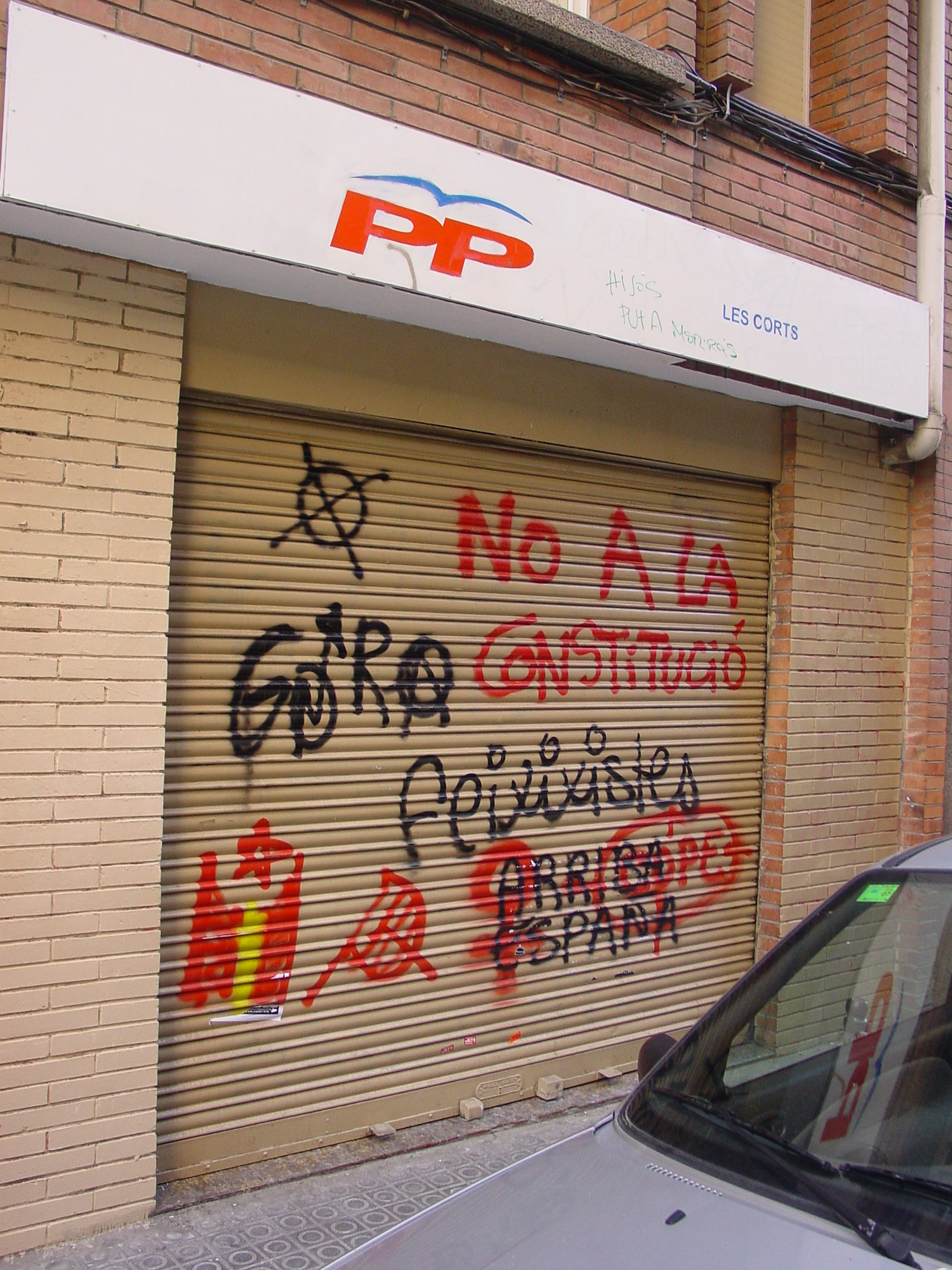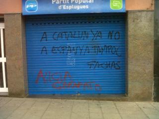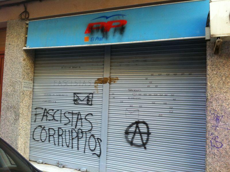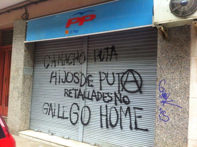 En El Prat, el ataque sufrido por la sede del PP fue más telegráfico. Las pintadas pedían el final de los recortes e insultaba a Sánchez Camacho y a todos los militantes y simpatizantes del partido
