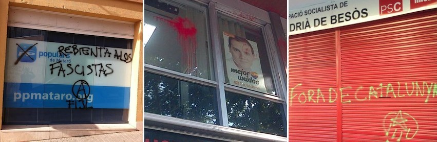 En la noche del 12 al 13 de octubre, unos militantes de las juventudes del partido socialista fueron atacados por otros jóvenes que provocaron destrozos en un local socialista del distrito barcelonés de "Les Corts" mientras proferían gritos a favor de la independencia. Unos días antes, poco después de la Diada, la sede del PSC en Sant Adrián del Besós, amanecía con la pintada "Fora de Catalunya!" firmada por "Arran", las juventudes de las Candidatures d'Unitat Popular (CUP), uno de cuyos diputados desencadenó el incidente que acabó con el abandono del hemiciclo del parlamento catalán de los diputados de Ciutadans primero y el PP a continuación.
