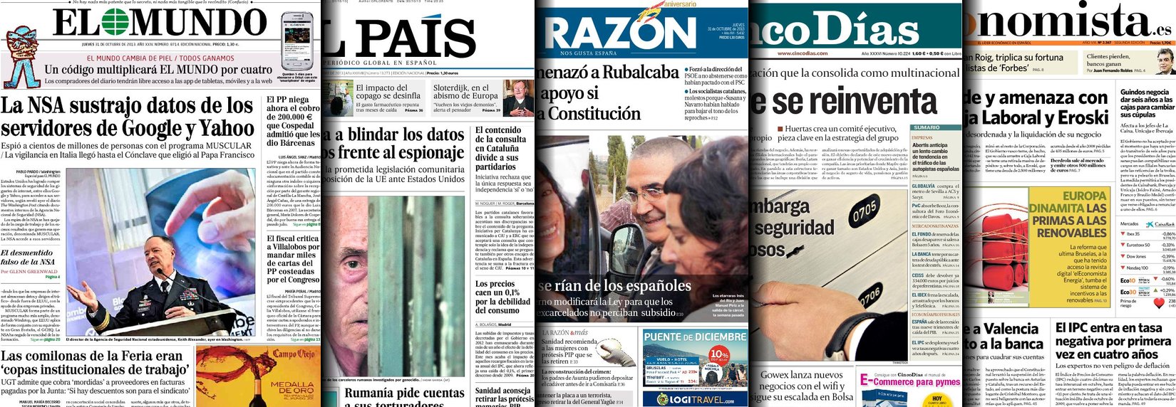 Portadas de los diarios El Mundo, El País, ABC, La Razón, La Vanguardia, La Gaceta, El Periódico, Cinco Días, El Economista, Expansión, Marca, As, Mundo Deportivo y Sport.