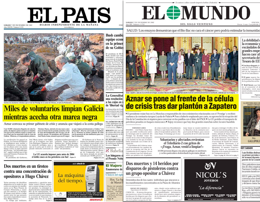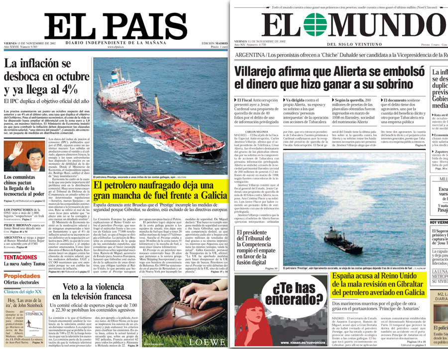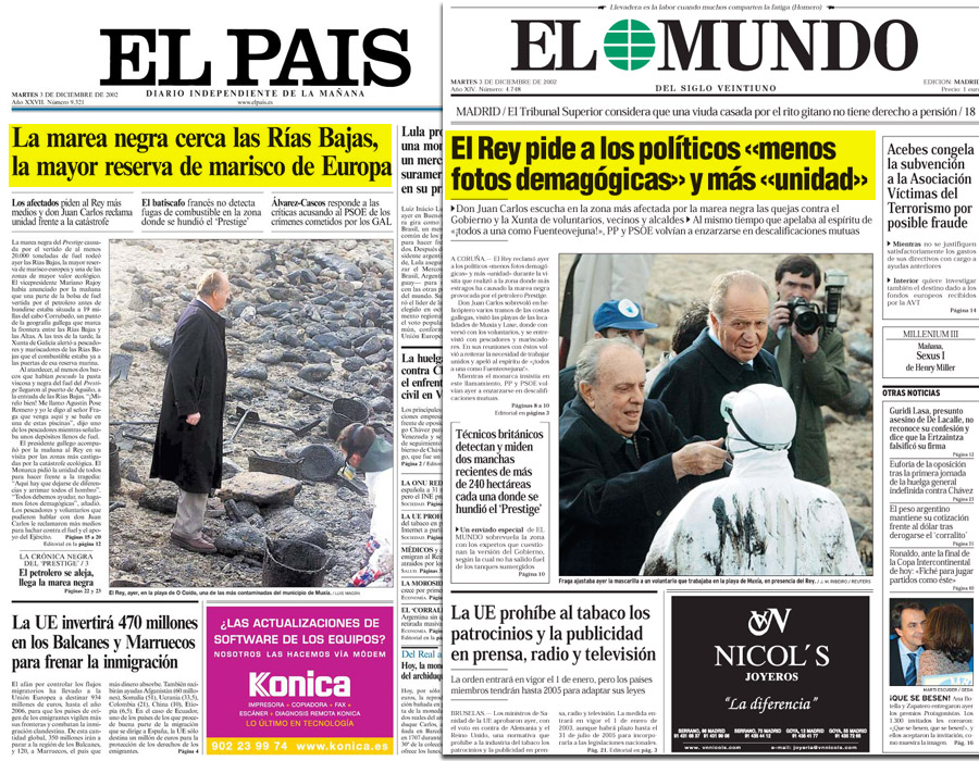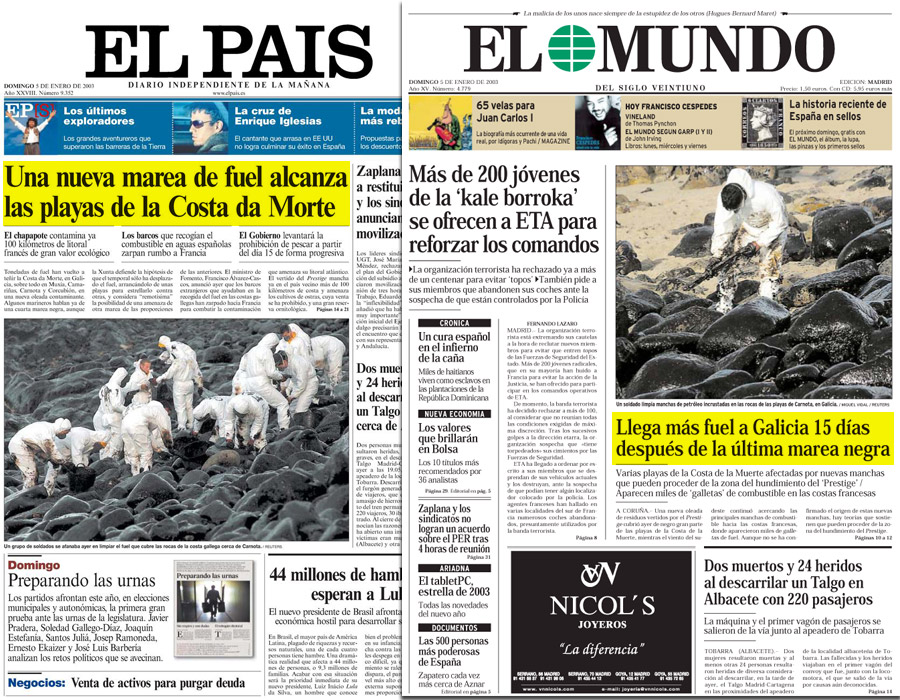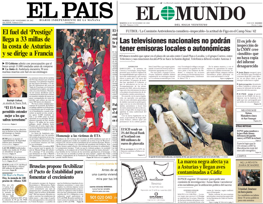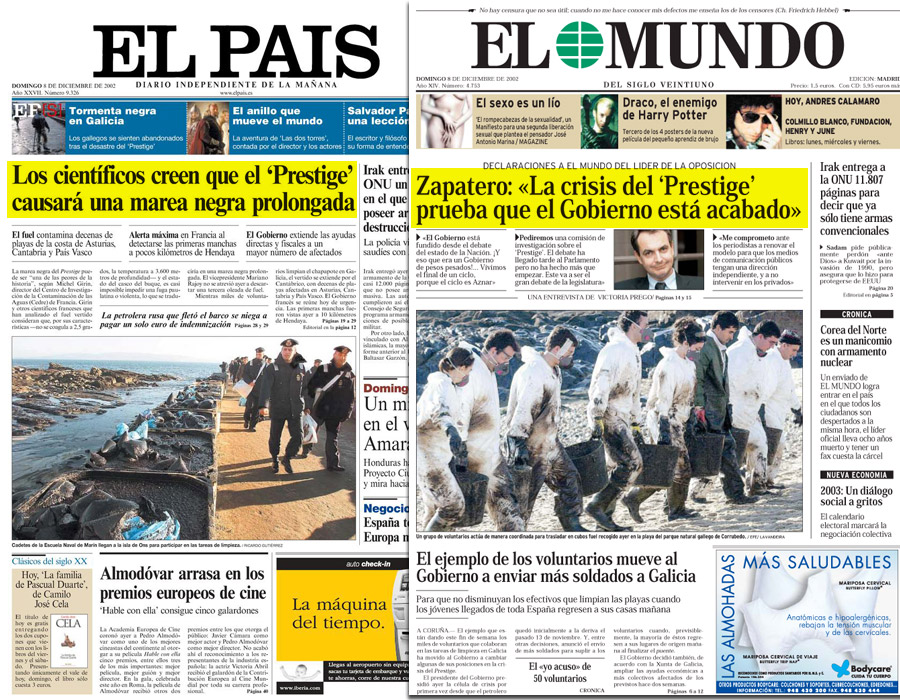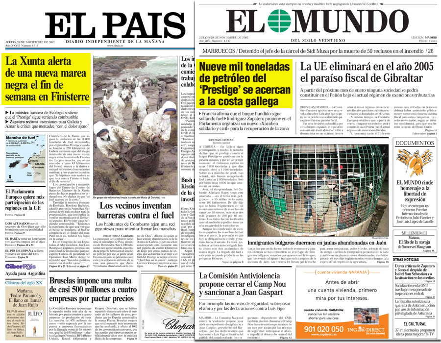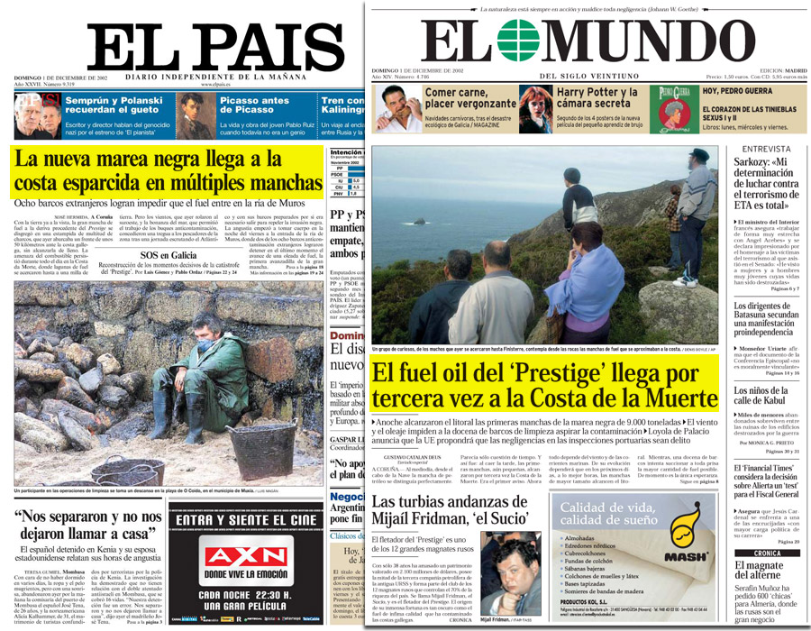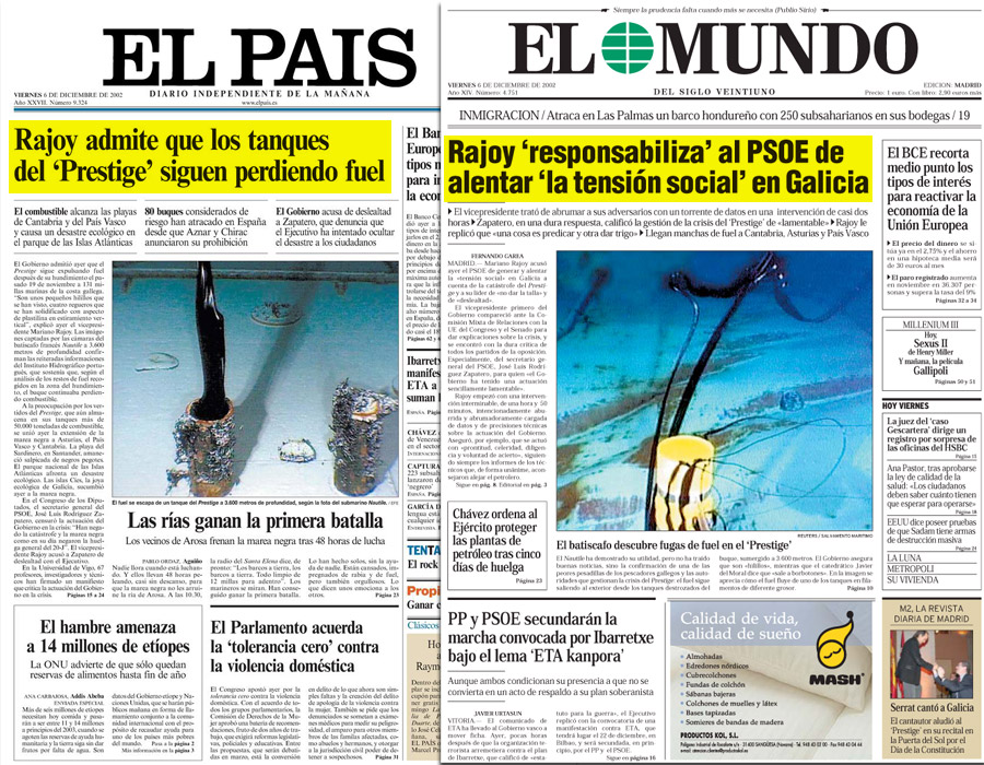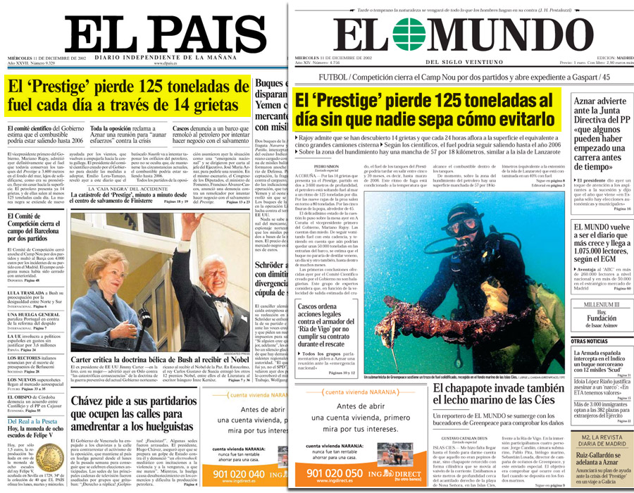 Durante dos meses el desastre del Prestige estuvo en las portadas de los periódicos prácticamente a diario. Presentamos cómo lo ofrecieron los dos diarios más influyentes de España: El País y El Mundo.