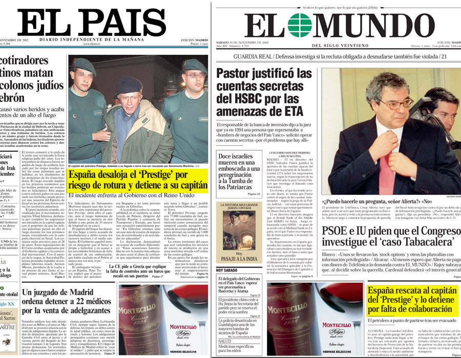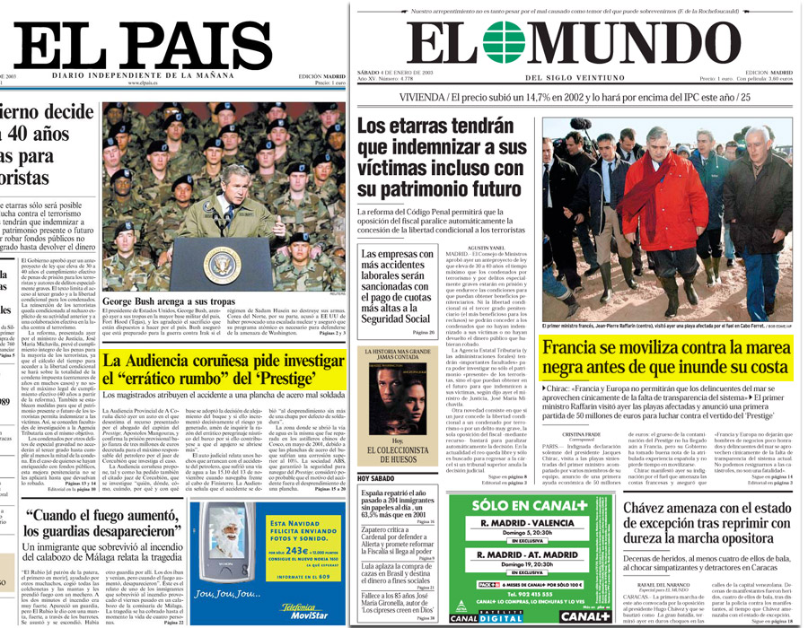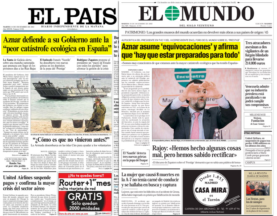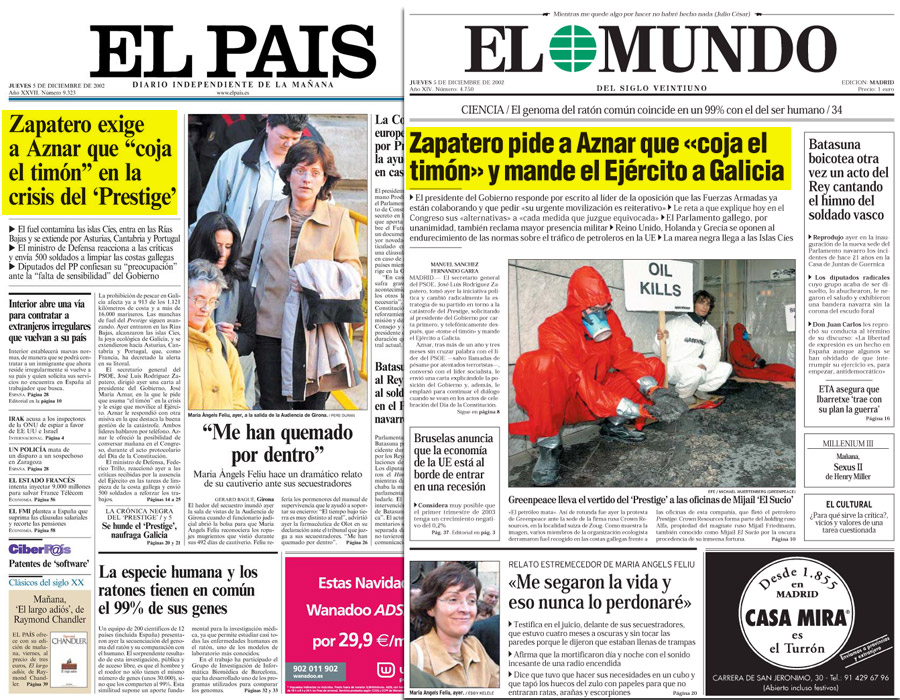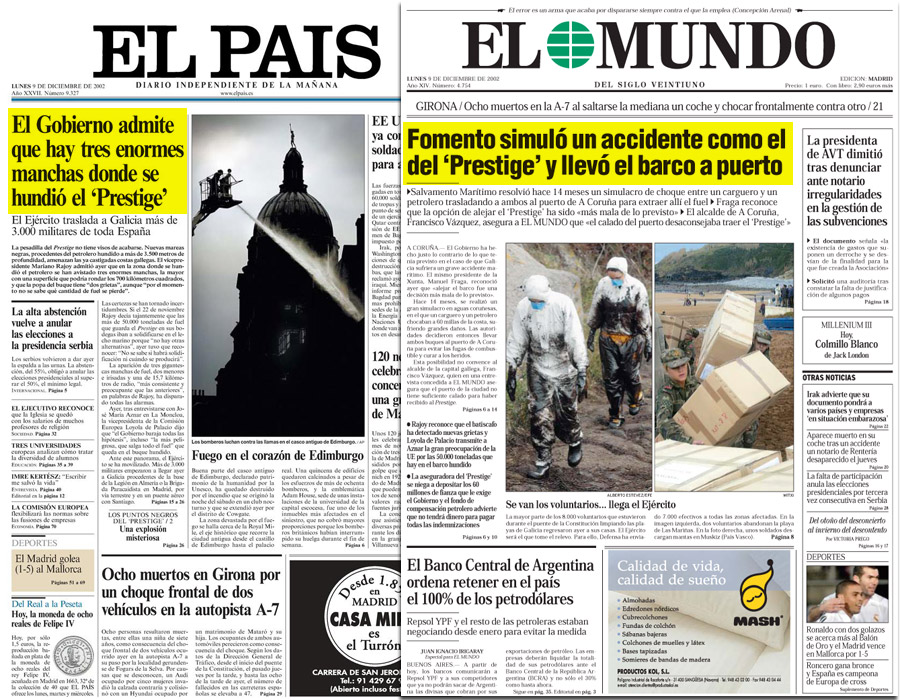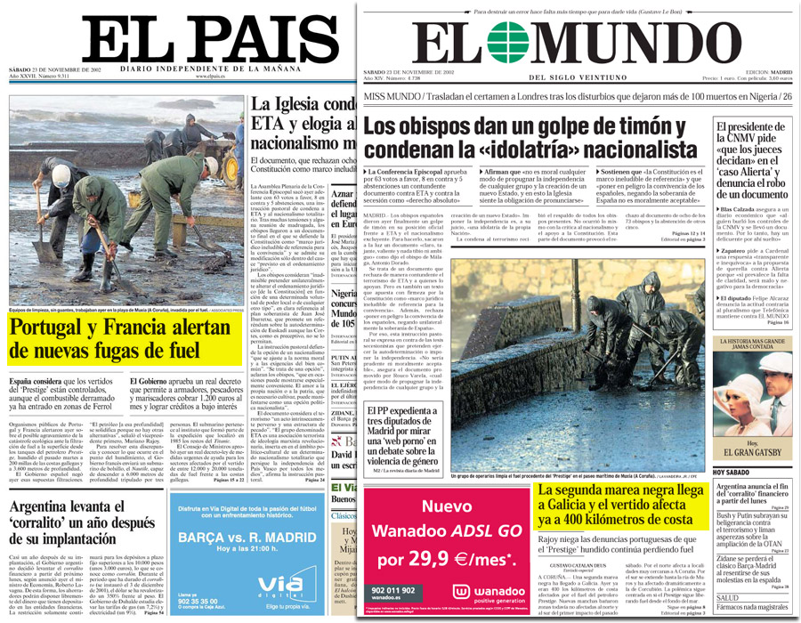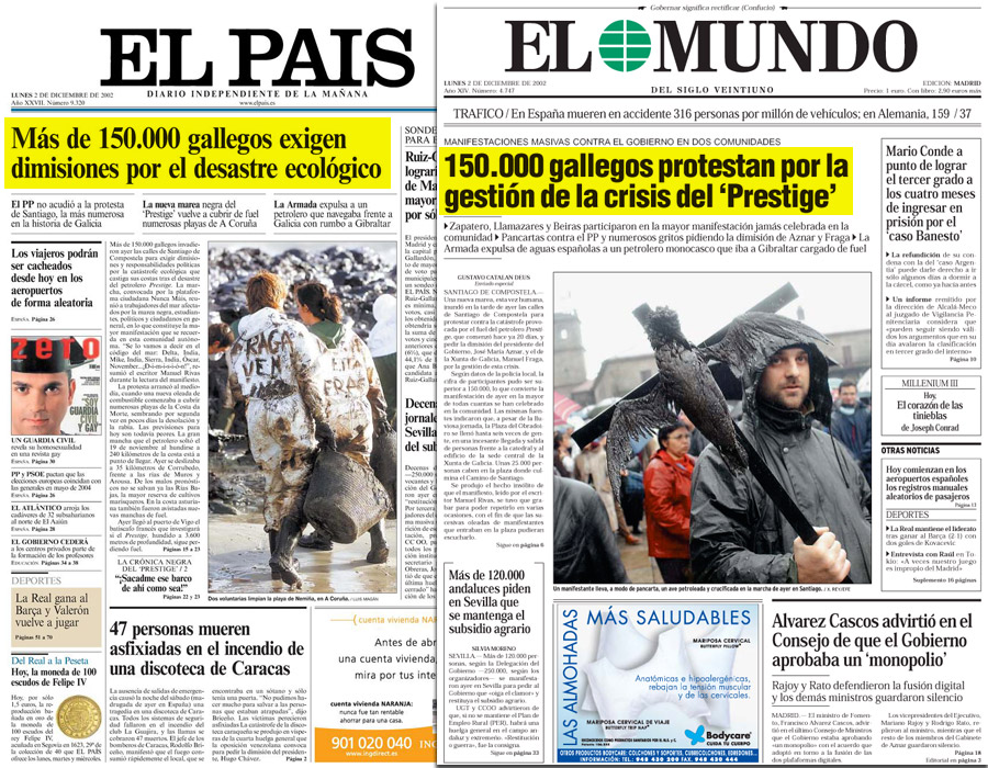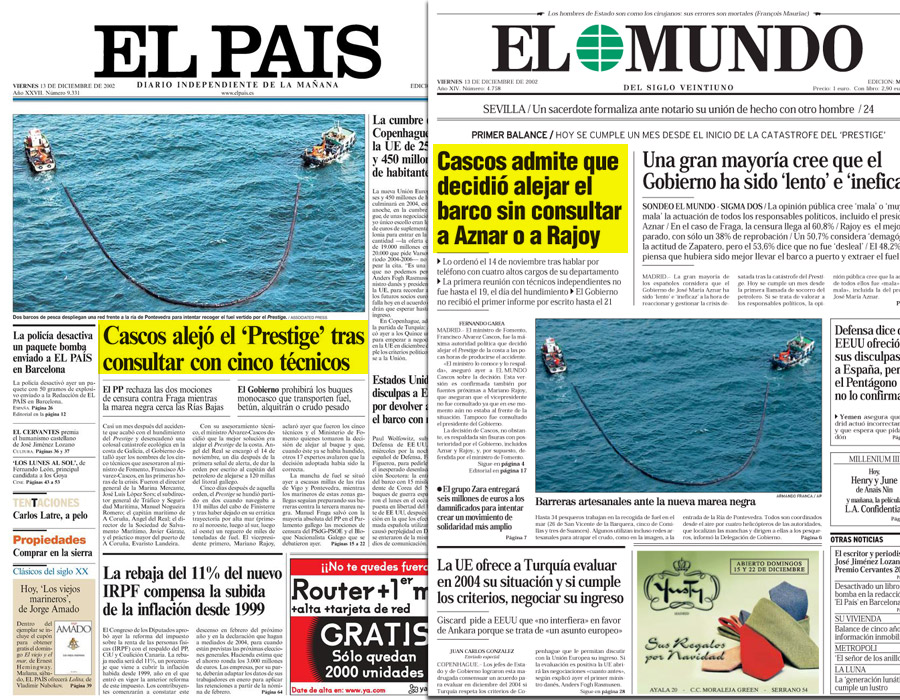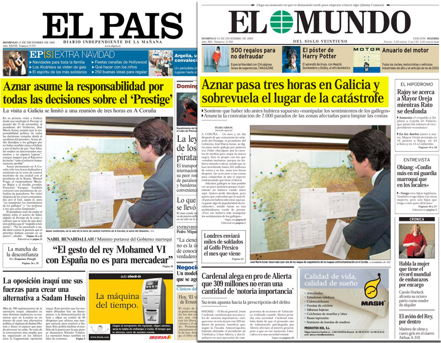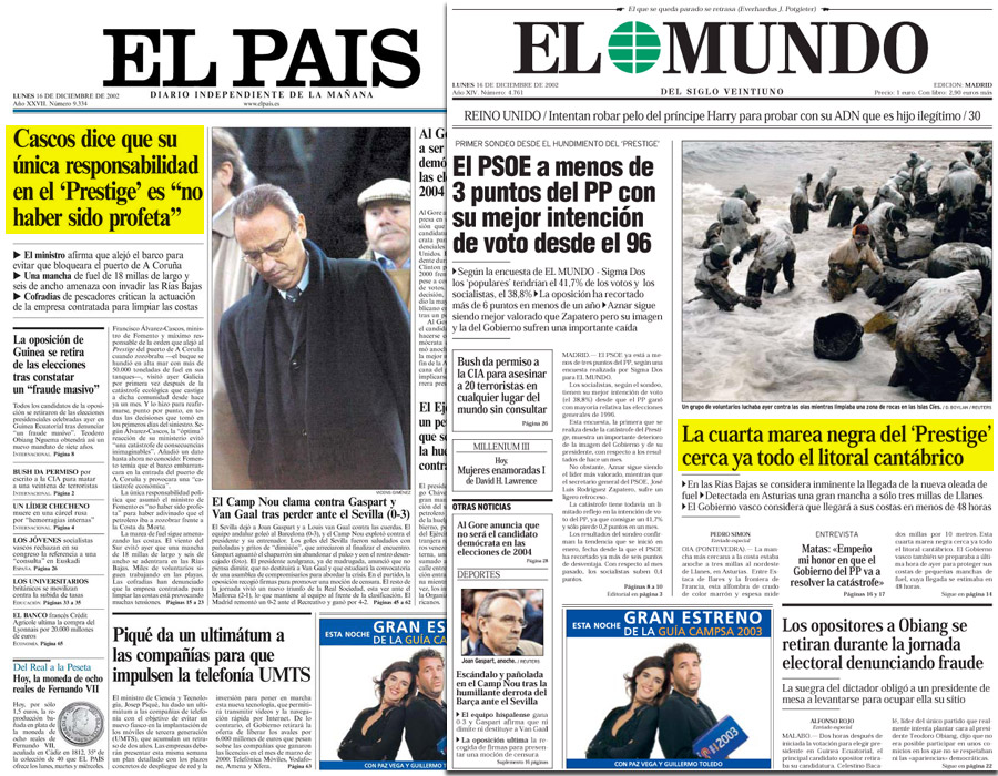 Durante dos meses el desastre del Prestige estuvo en las portadas de los periódicos prácticamente a diario. Presentamos cómo lo ofrecieron los dos diarios más influyentes de España: El País y El Mundo.