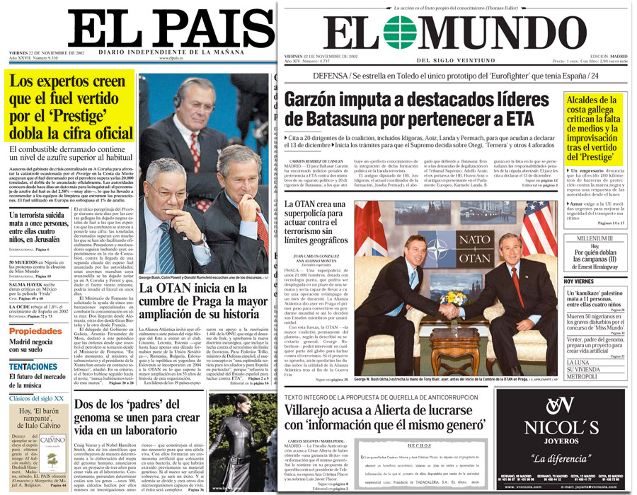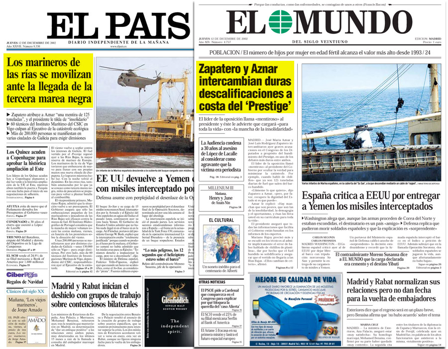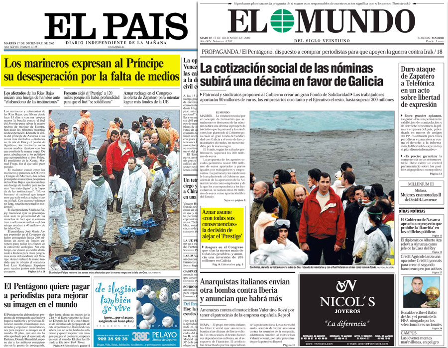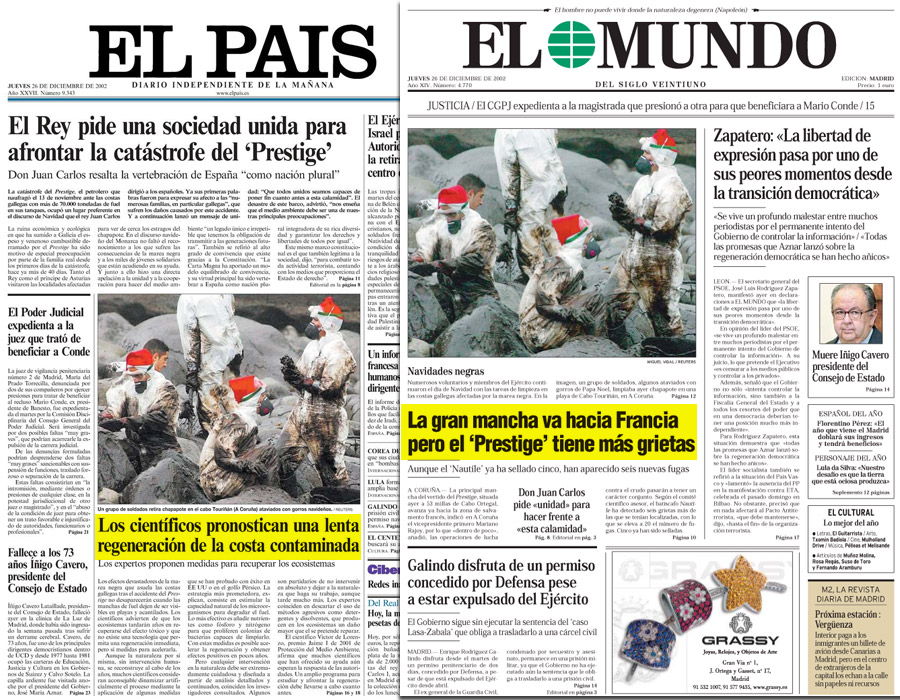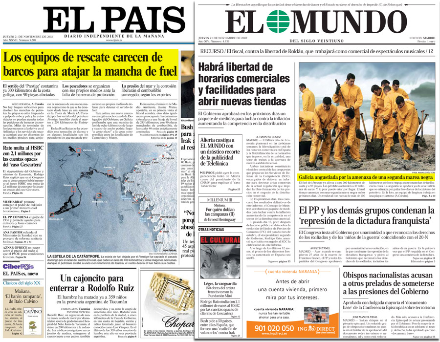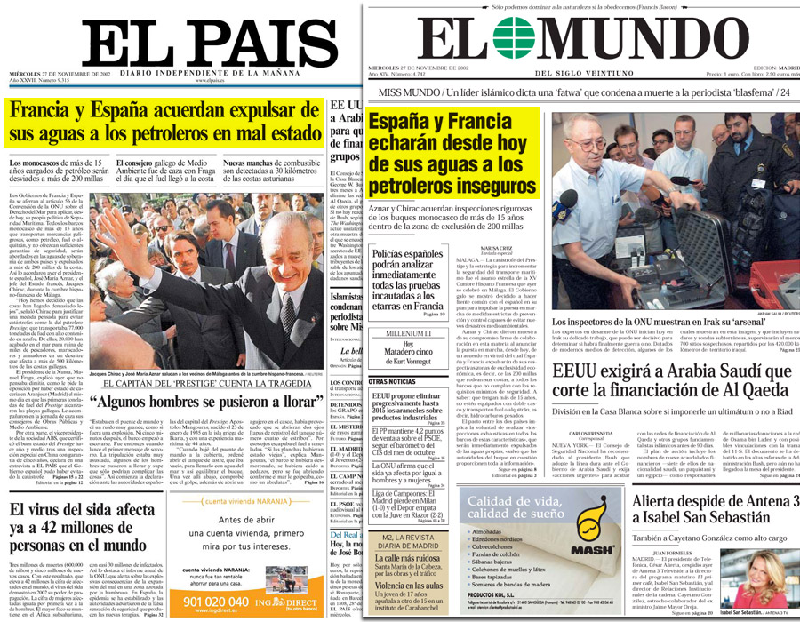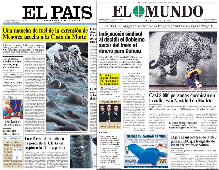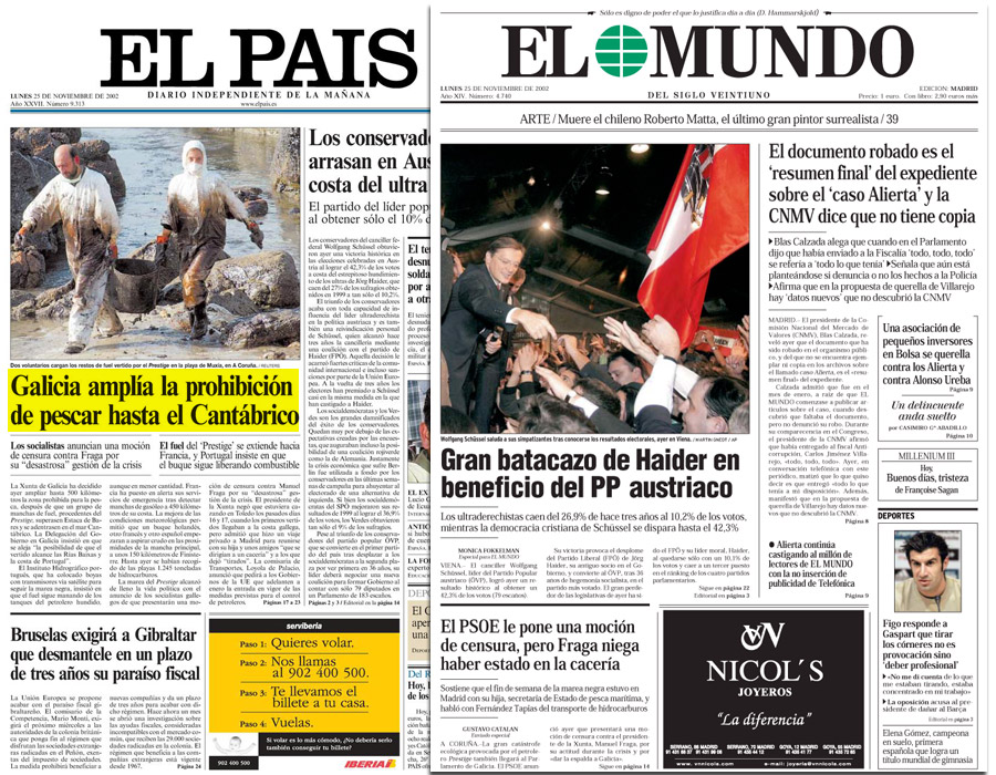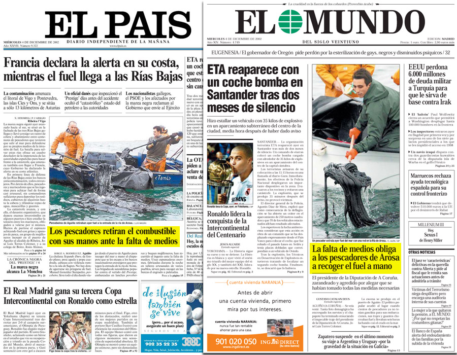 Durante dos meses el desastre del Prestige estuvo en las portadas de los periódicos prácticamente a diario. Presentamos cómo lo ofrecieron los dos diarios más influyentes de España: El País y El Mundo.
