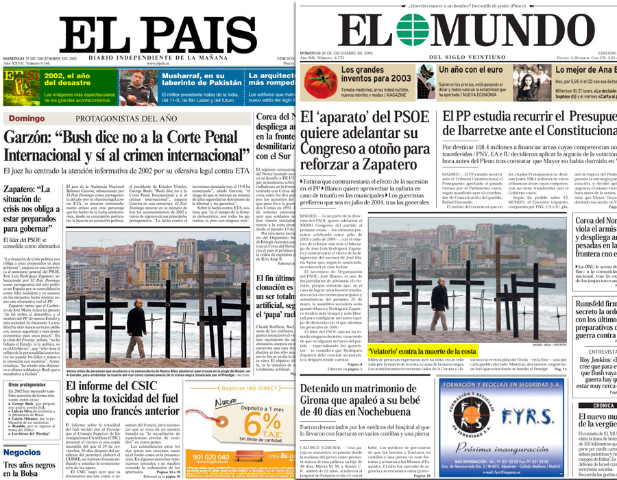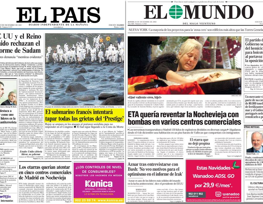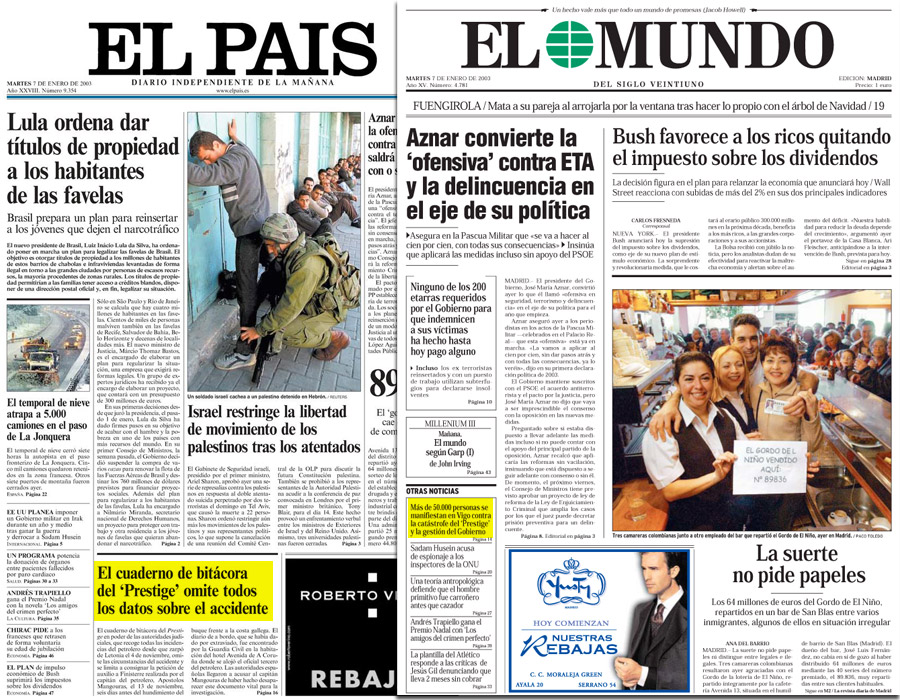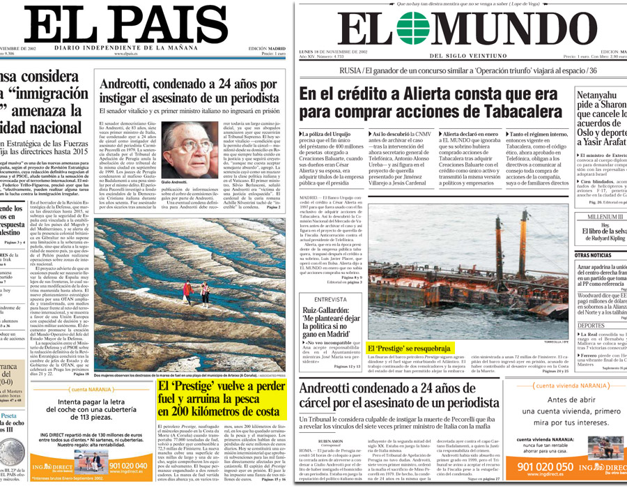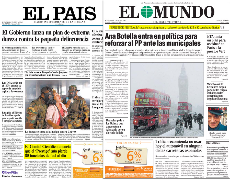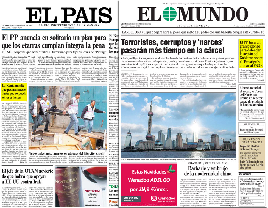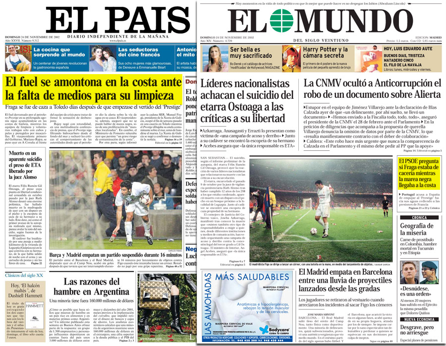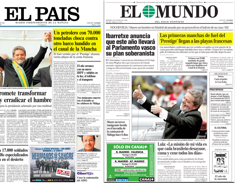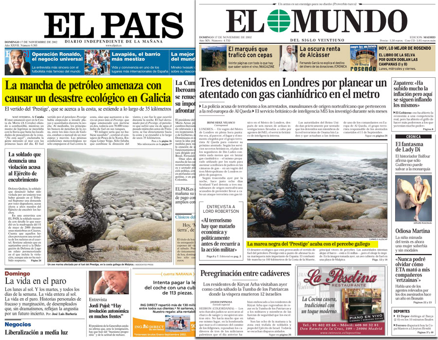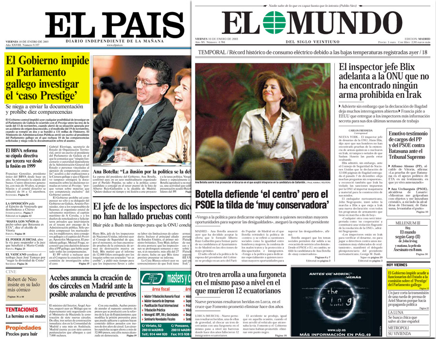 Durante dos meses el desastre del Prestige estuvo en las portadas de los periódicos prácticamente a diario. Presentamos cómo lo ofrecieron los dos diarios más influyentes de España: El País y El Mundo.