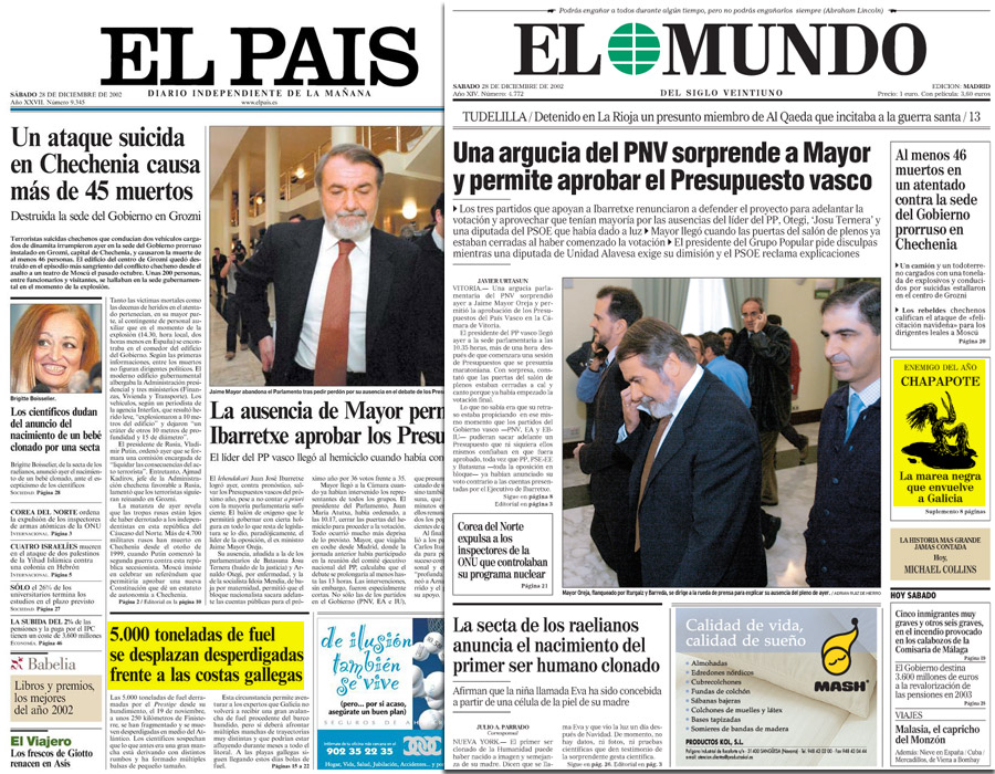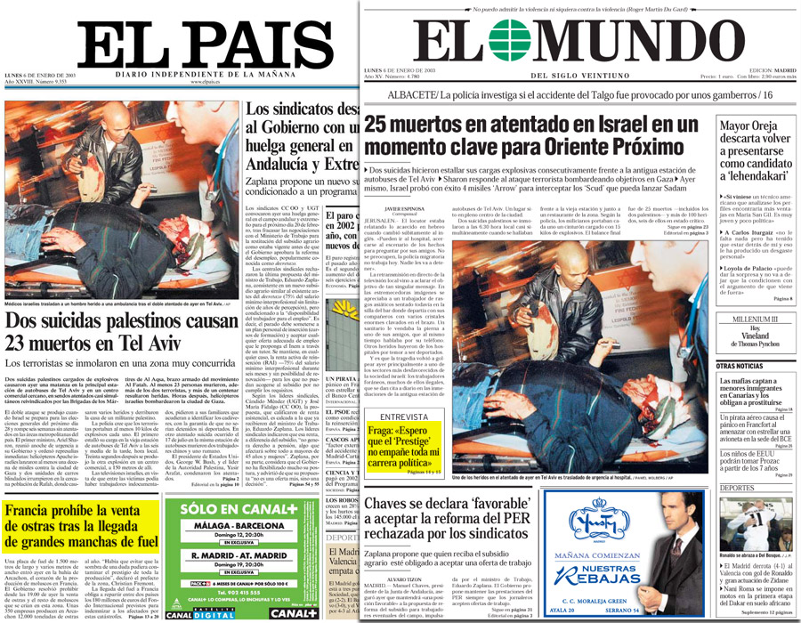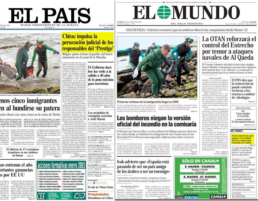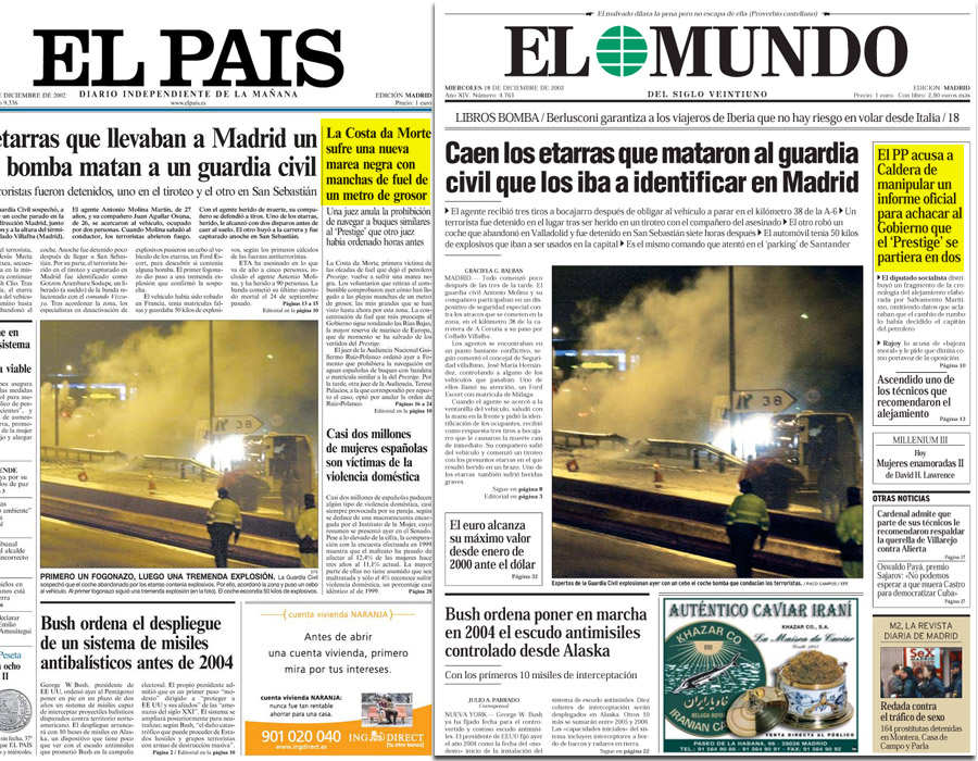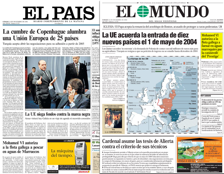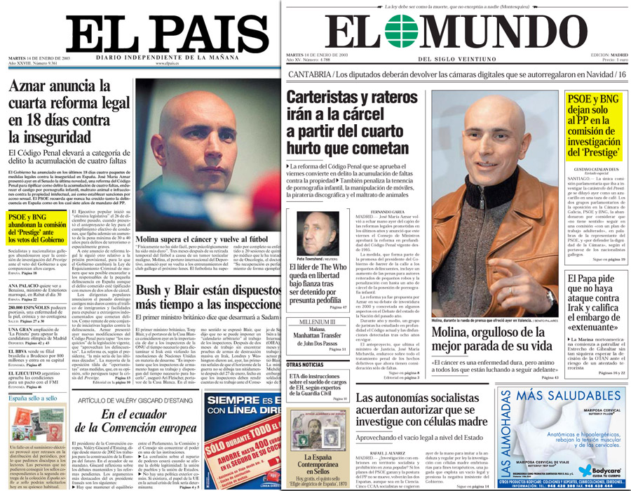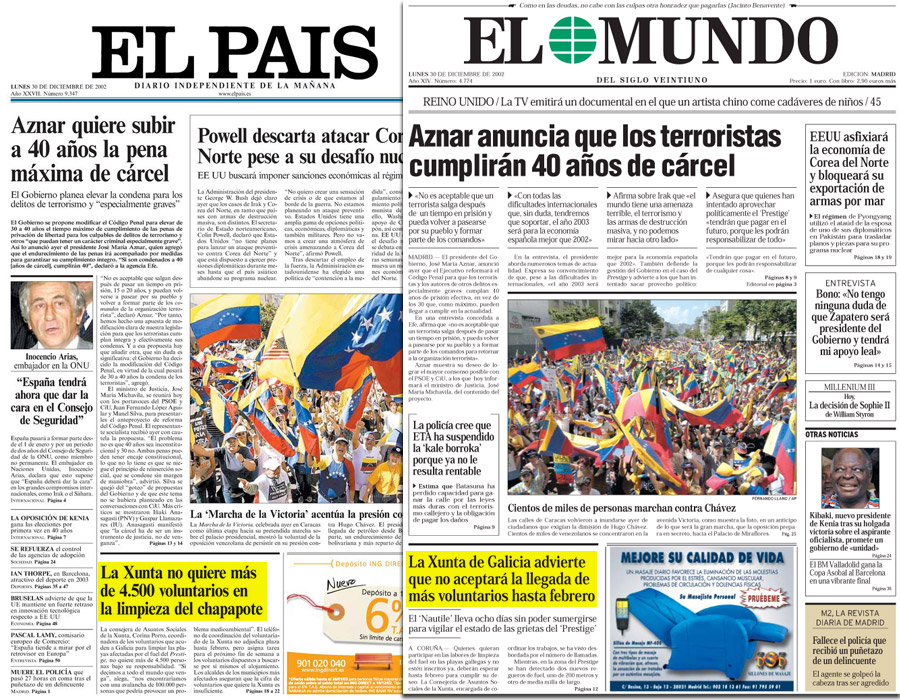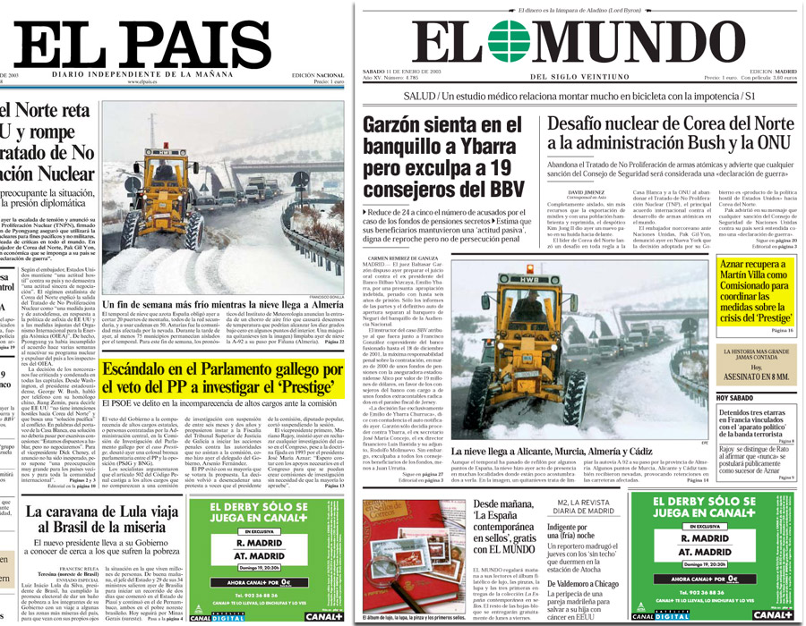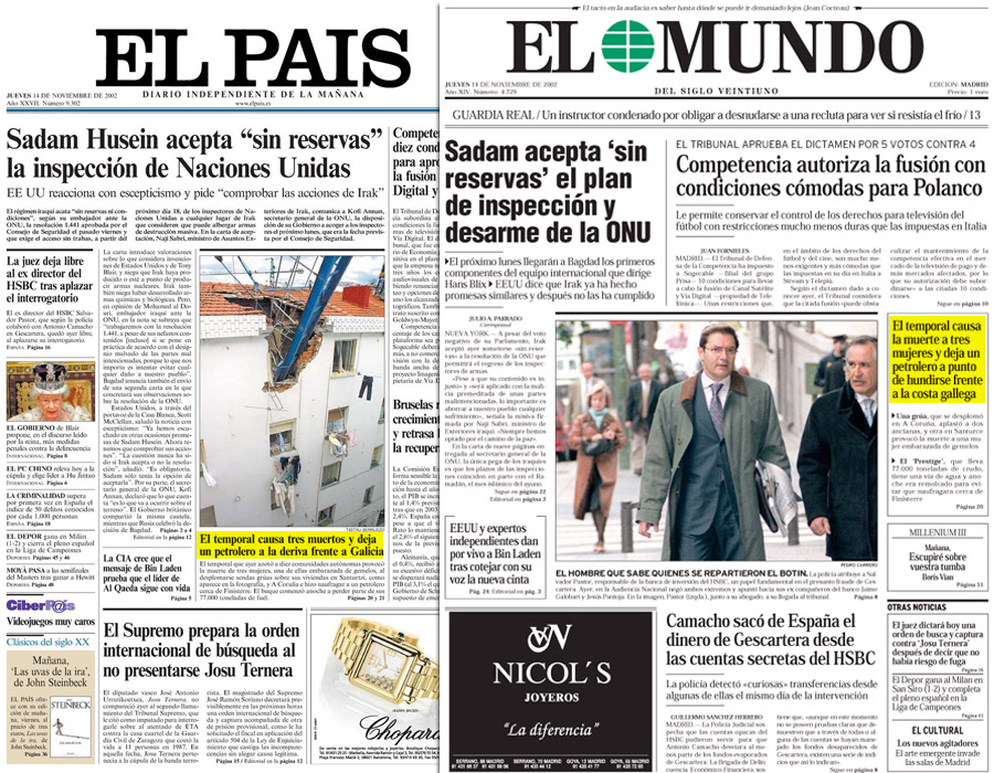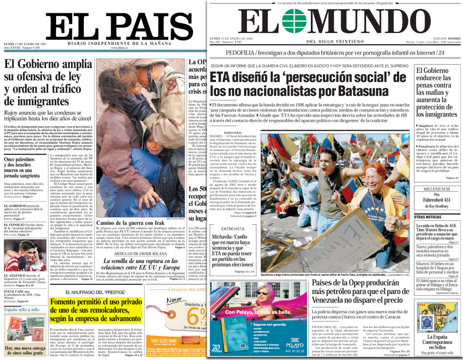 Durante dos meses el desastre del Prestige estuvo en las portadas de los periódicos prácticamente a diario. Presentamos cómo lo ofrecieron los dos diarios más influyentes de España: El País y El Mundo.