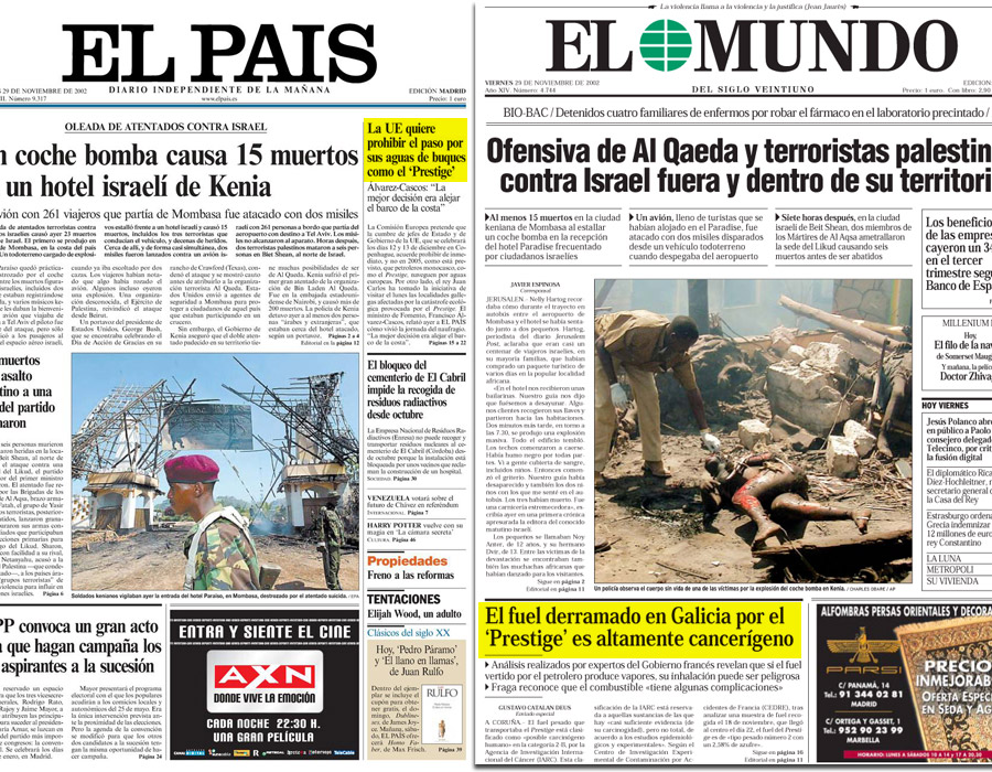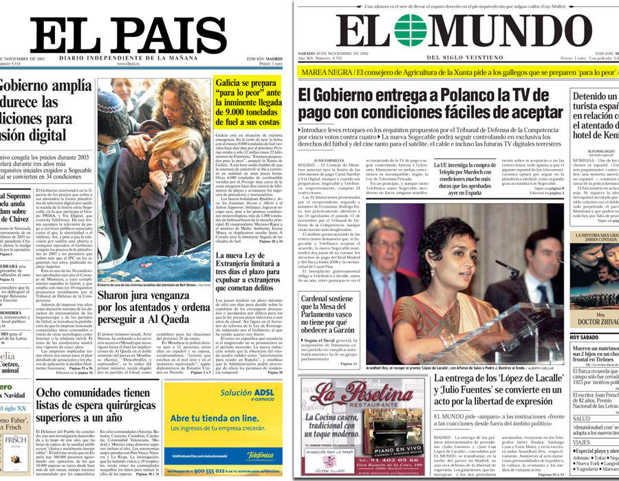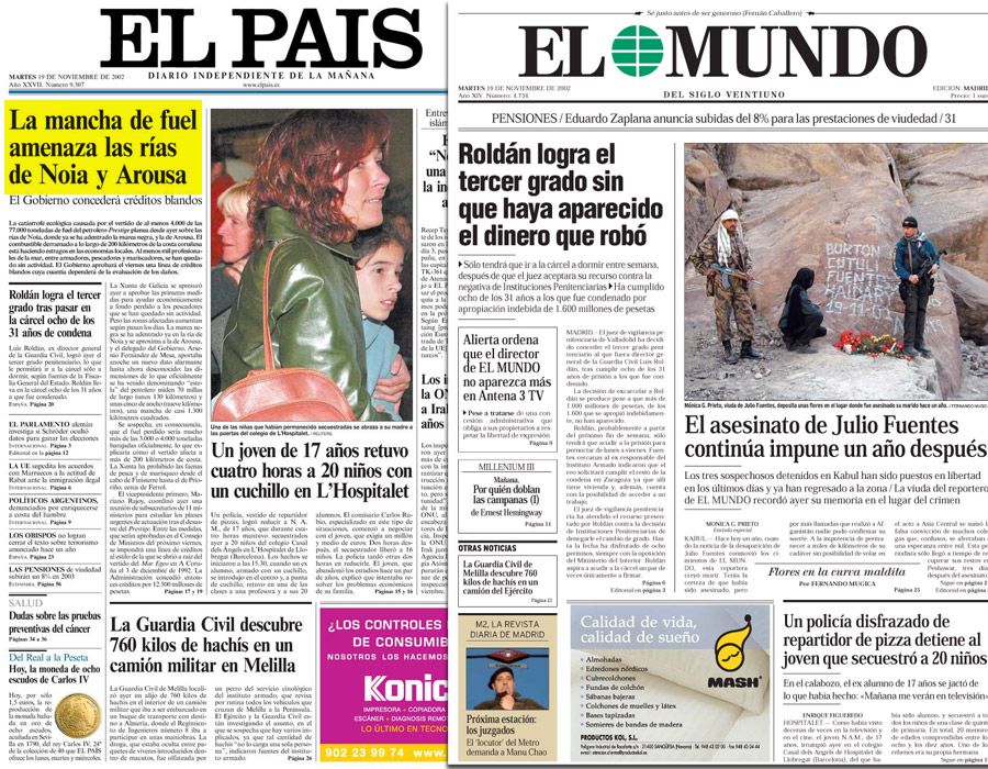 El martes 19 de noviembre el Prestige ni aparece en la portada de El Mundo. Para El País es el tema principale del día, con otro titular en el que aparece la palabra "amenaza".