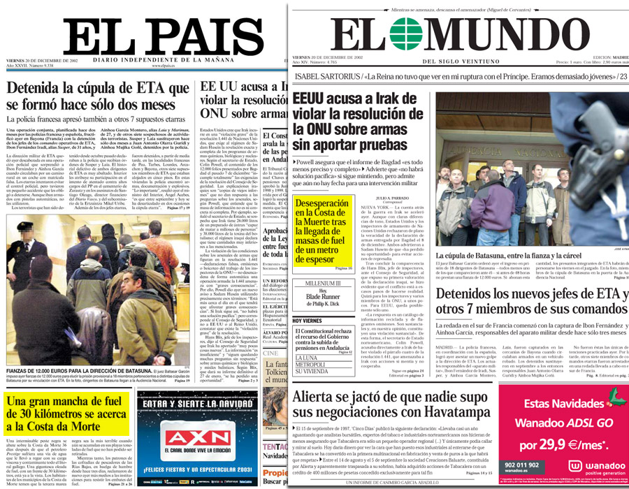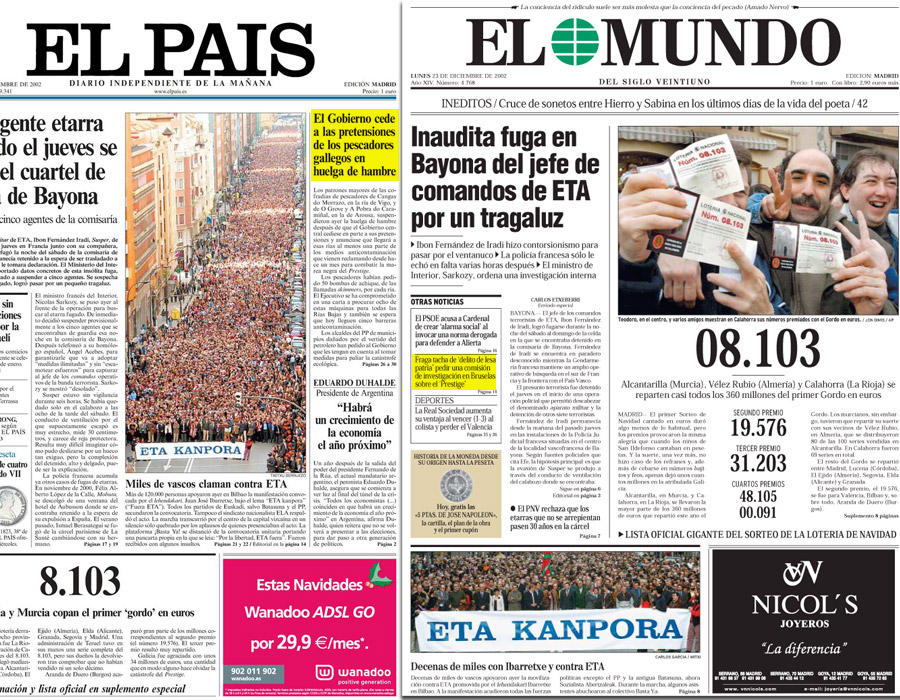 La lotería de Navidad y la fuga de un etarra arrinconan al Prestige en las portadas.