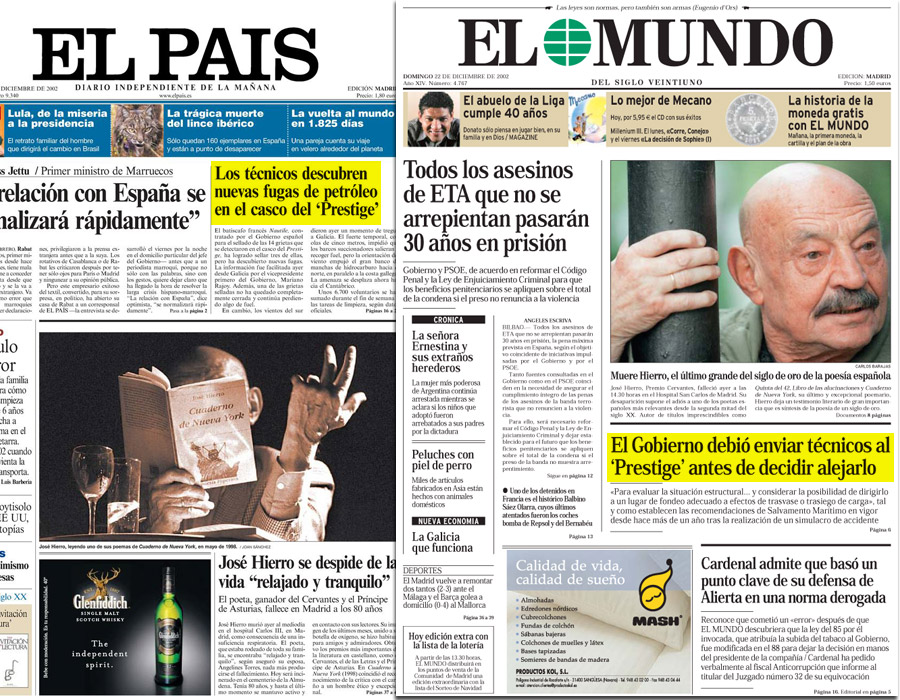 Muere el poeta José Hierro y el asunto del Prestige pierde algo de fuelle en las portadas.
