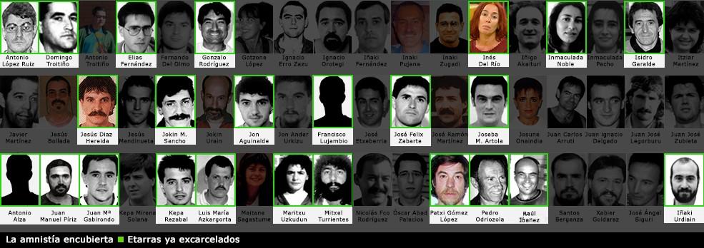 Se trata de los terroristas de ETA Antxon López Ruiz, Kubati, asesino de la terrorista arrepentida María Dolores González Catarain, Yoyes, y que acumula condenas de 1.210 años por 13 asesinatos y 8 atentados con muerte; la integrante del grupo Madrid Inmaculada Noble, condenada por el asesinato del comandante Ricardo Sáenz de Ynestrillas en 1986, entre otros atentados; junto a Francisco Javier Lujambio Galdeano, Jesús Díaz de Heredia Ruiz de Arbulo, Pedro Juan Odraizola Aguirre, Juan María Gabirondo Agote, Pedro María Rezabal Zurutuza, Miguel Turrientes Ramírez, José Félix Zabarte Jainaga, María Josefa Urkudun Etxenagustia, Antonio Alza Hernández -pertenece a la denominada Vía Nanclares-, Raúl Ibañez y Gonzalo Rodríguez Cordero. Todos ellos están condenados por delitos de asesinato.