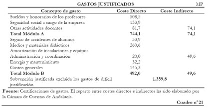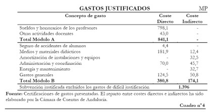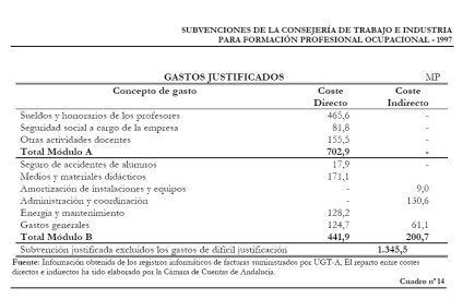 El informe de fiscalización realizado por la Cámara de Cuentas andaluza en 1998 sobre las subvenciones a la formación que reciben sindicatos y empresarios es el único que se conoce que analice con detalle el destino del dinero de los cursos. En aquel informe se desprende que CCOO y UGT destinaron casi el 50 por ciento del importe de las subvenciones recibidas en gastos de gestión, generales y de funcionamiento a los que podría obtener beneficios posteriores mediante las subcontrataciones. La Conferencia de Empresarios Andaluces destinó el 40 por ciento a los mismos menesteres. De tal dato dio cuenta Libertad Digital en 2010. Este jueves, El Mundo destaca que UGT se queda cuando menos con el 19% del importe final de los cursos que imparte.