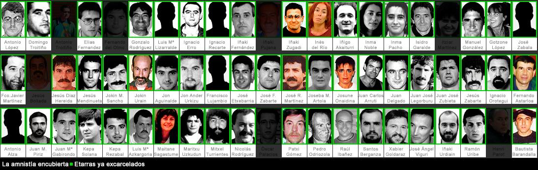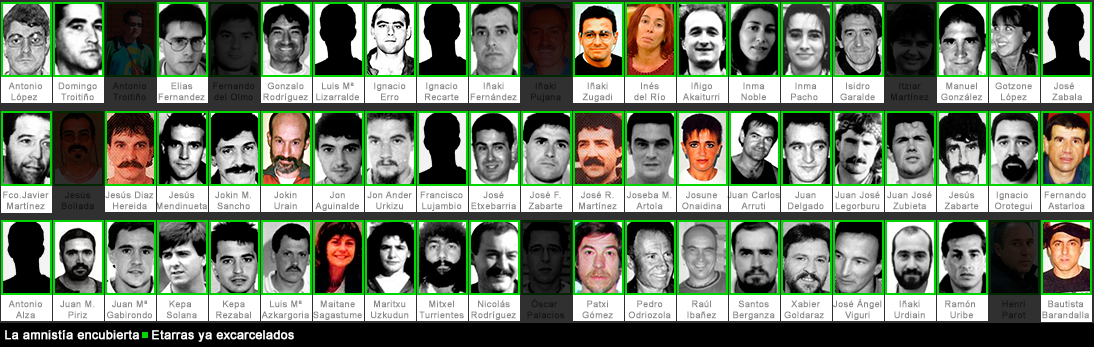 Los seis excarcelados este miércoles son José Ramón Martínez de la Fuente Inchaurraga Txorito, Miren Josune Onaindia Susaeta, Joseba Iñaki Zugadi García, José Gabriel Zabala Erasun, Fernando Vicente de Luis Astarloa y Kepa Solana Arrondo.