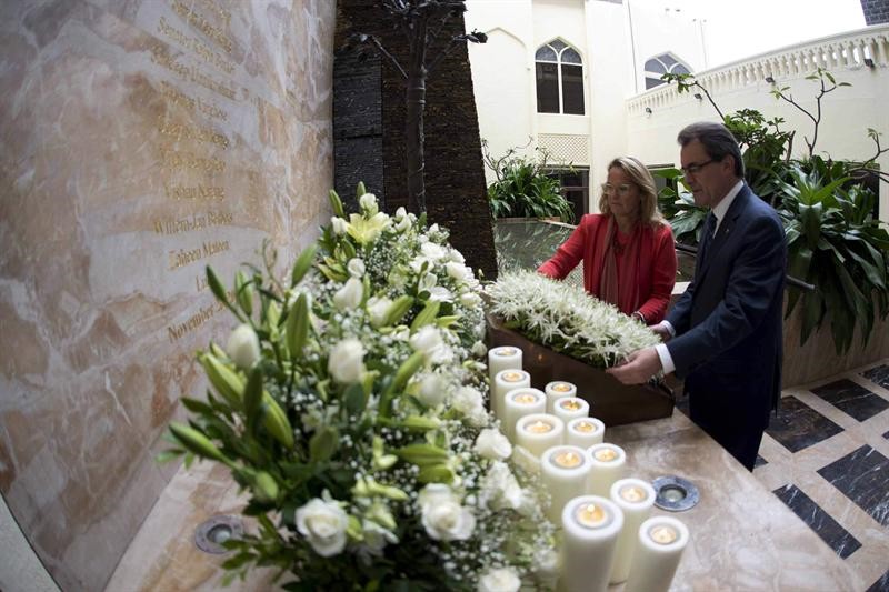 Mas y su mujer, Helena Rakosnik, durante la ofrenda floral realizada con motivo del quinto aniversario del atentado al hotel Taj Palace de Mumbay