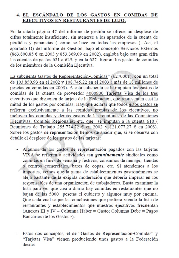En esa contabilidad interna se encuentran los escandalosos movimientos de Visa que tres dirigentes cargaban a sus tarjetas Visa en "gastos de representación" mariscadas semanales y comidas en fines de semana, incluso de agosto, en lujosos restaurantes. La sentencia confirma las comilonas puesto que considera que la FSP no ha demostrado que los documentos estén falsificados.