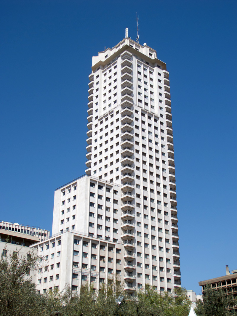 Uno de los rascacielos más longevo de la capital de España, la Torre de Madrid, construida en 1957, continúa siendo uno de los edificios más altos del país con 142 metros y 34 plantas.