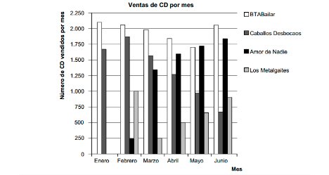 - Los nuevos CD de los grupos BTABailar y Caballos Desbocaos salieron a la venta en enero. En febrero los siguientes CD de los grupos Amor de Nadie y Los Megatalgaites. El siguiente gráfico muestra las ventas de CD de estos grupos desde enero hasta junio.