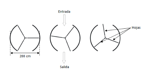 - Puerta giratoria. Una puerta giratoria consta de tres hojas que giran dentro de un espacio circular. El diámetro interior de dicho espacio es de 2 metros (200 centímetros). Las tres hojas dividen el espacio en tres sectores iguales. El siguiente plano muestra las hojas de la puerta en tres posiciones diferentes vistas desde arriba.