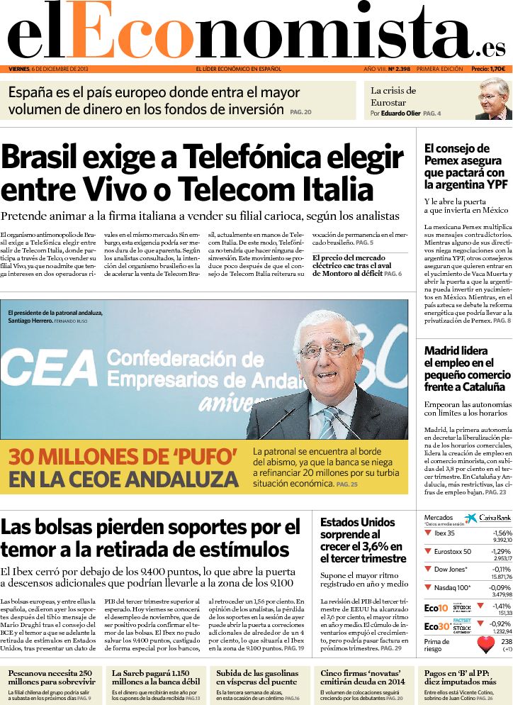 "Brasil exige a Telefónica elegir entre Vivo o Telecom Italia", "Las bolsas pierden soportes por el temor a la retirada de estímulos"