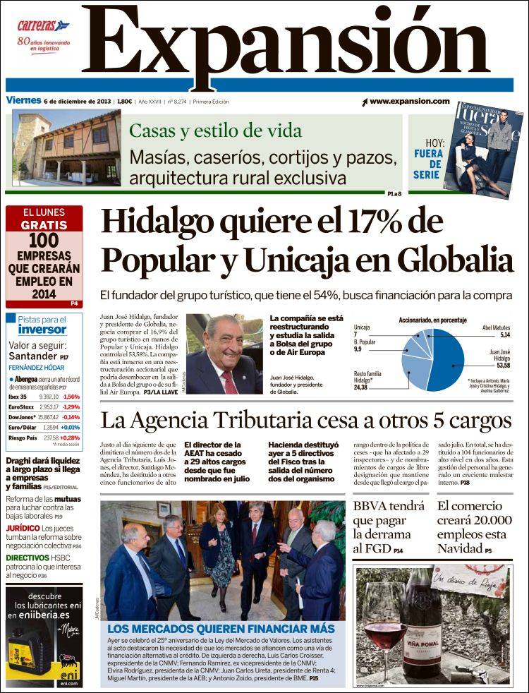 "Hidalgo quiere el 17% de Popular y Unicaja en Globalia", "La Agencia Tributaria cesa a otros 5 cargos"