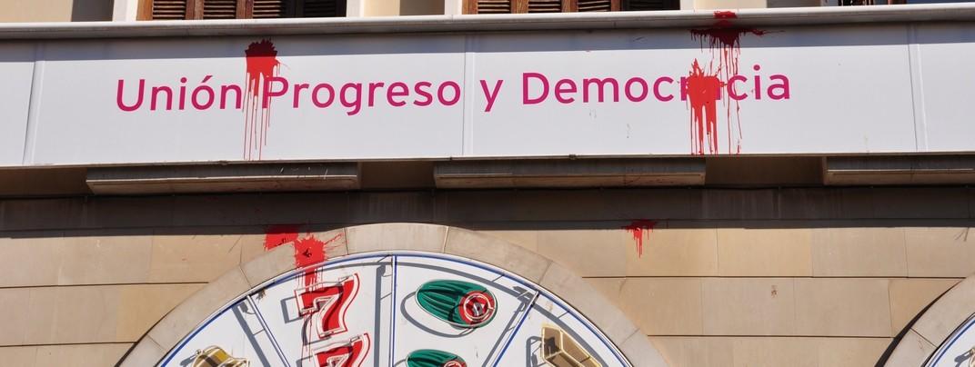 La sede de Unión, Progreso y Democracia -UPyD- en Baleares fue atacada este fin de semana por un grupo de vándalos que arrojaron bolas de pintura roja contra el cartel de su fachada, informa Europa Press.