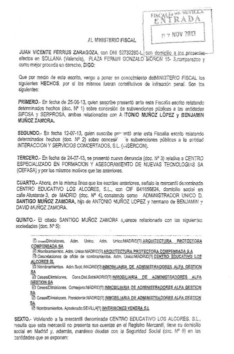 El pasado 7 de noviembre se presentada la ultima denuncia que insistía en las irregularidades cometidas en la concesión de subvenciones a la formación profesional a otra empresa ligada a la familia de Benjamín Muñoz Zamora, socio de Amparo Rubiales, ex presidenta del PSOE andaluz y Javier Pérez Royo, ex asesor aúlico de Manuel Chaves, en el Estudio Jurídico Itálica y otras empresas. Este es el documento oficial de la última denuncia: