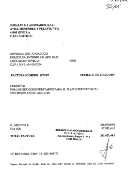 Estas es una de las dos facturas por importe de 311.622.44 euros que emitió Soralpe a UGT-Andalucía. La otra fue de 88.377,56, y ambas sumadas dan la cantidad exacta de 400.000 euros.