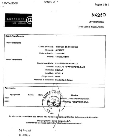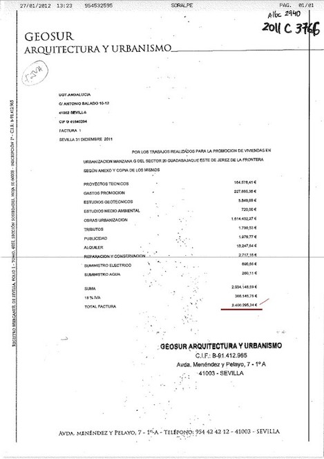 La empresa Geosur Arquitectura y Urbanismo, SL, que es una empresa de UGT en la que aparece como consejero junto con otros el exalcalde socialista de Sevilla, Manuel del Valle Arévalo, le presentó facturas a UGT por importe de 2.665.377,75 euros por los trabajos de urbanización y diversas gestiones de unos pisos en Jerez de la Frontera que nunca se hicieron. Ocho millones de euros más tarde, las viviendas no existían. Hacienda ha comenzado una investigación por pagos irregulares y lo que sí aparece ya claro es que la empresa Geosur, la propia UGT como entidad y Soralpe I más P Asociados tienen sorprendentes relaciones.