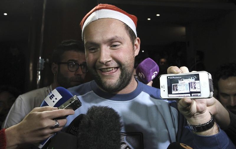 El canario Jesus Lorente muestra en su móvil una foto del décimo con el número 79.712, con el que ha sido agraciado con el segundo premio en el Sorteo Extraordinario de la Lotería de Navidad. Según los datos facilitados por Loterías y Apuestas del Estado, el número se ha vendido íntegramente en Granadilla de Abona. El agraciado se encontraba en el salón del Teatro Real