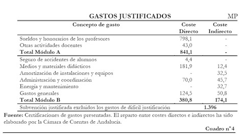 Como puede apreciarse, de los cerca de 8,4 millones de euros - 1.396 millones de pesetas- considerados como gastos justificados por la Cámara en las subvenciones determinadas que analiza relativas a la formación, sólo 5 millones de euros -841,1 de pesetas- fue a parar a sueldos y honorarios de profesores, esto es, el 60 por ciento. El 40 por ciento restante, 3,36 millones de euros- 554,9 millones- iban destinados a seguros, materiales, administración, gastos generales, etc. proporcionados por la CEA.