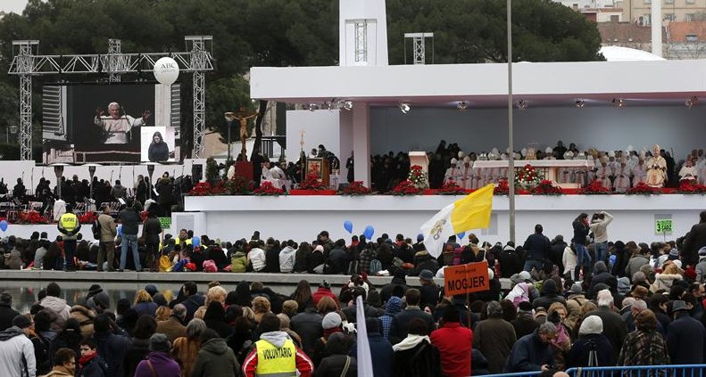 A las 12.00 horas, las pantallas gigantes colocadas en la plaza emitirán en directo, como es habitual en esta celebración, el mensaje del pontífice, en esta ocasión el primero de Francisco, que dirigirá desde Roma a las familias presentes en el acto. A continuación dará comienzo la eucaristía, a la que está previsto que asistan unas 500.000 personas y cerca de 50 obispos.