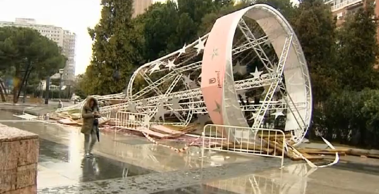 El fuerte viento que azota la capital derribó este mediodía el árbol de Navidad ubicado en la plaza de Colón, junto a la confluencia de las calles Serrano y Goya, después de que la pasada madrugada tirara el de la Cuesta de Moyano.