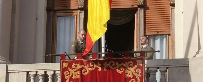 El acto de celebración de la Pascua Militar en el Palacio de Capitanía de Barcelona el mediodía de este lunes ha recuperado el izado de la bandera española en la fachada exterior del recinto.