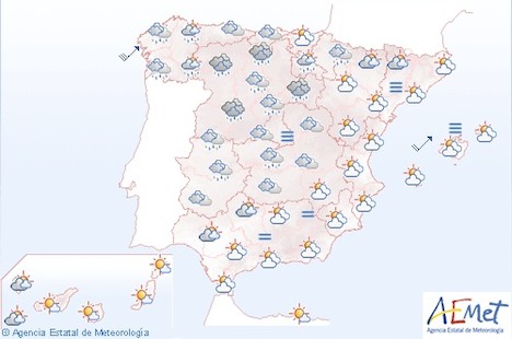 Durante la jornada, los cielos estarán muy nubosos o cubiertos en Galicia, Castilla y León y norte de Extremadura, con precipitaciones débiles localmente moderadas que, en el norte de Cáceres, extremo suroeste de Castilla y León y Rías Bajas pueden ser localmente persistentes. Con carácter más débil y disperso podrían afectar a otras zonas de la mitad noroeste peninsular, siendo menos probables cuanto más hacia el sudeste; con predominio de cielos poco nubosos en el resto del país, con algunas nubes altas.