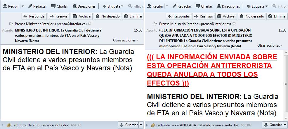 Un grave error del Ministerio del Interior, facilitando información publicable a los medios de comunicación sobre la operación policial ocurrida en el País Vasco y Navarra, pudo poner en peligro el desarrollo de la operación contra ETA ocurrida este miércoles.