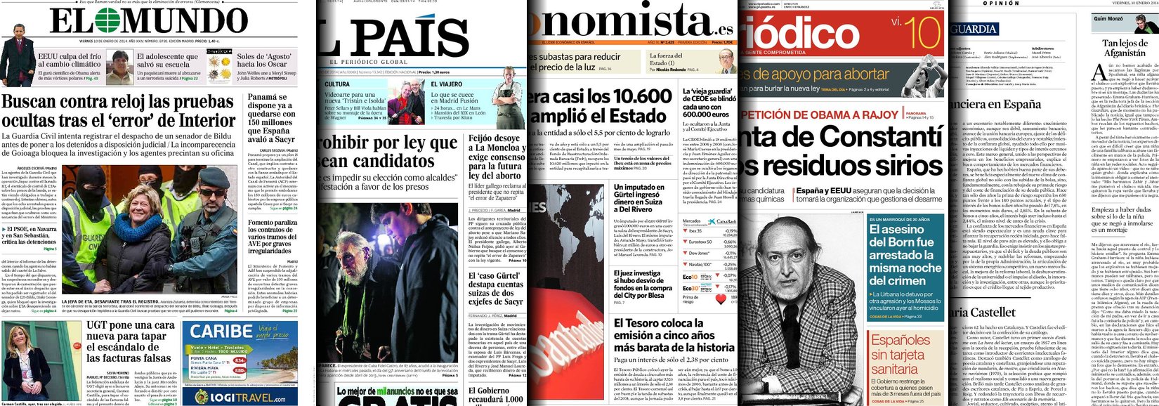 Portadas de los diarios El Mundo, El País, ABC, La Razón, La Vanguardia, El Periódico, Cinco Días, El Economista, Expansión, Marca, As, Mundo Deportivo y Sport.