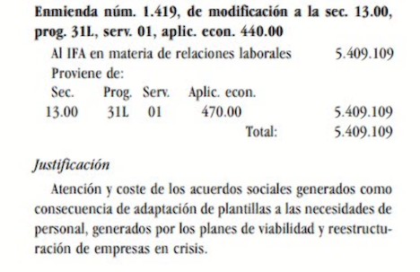 Lo esencial de la enmienda consiste, interpreta el diario de Unidad Editorial, en quitar 5.409.109 euros de la aplicación presupuestaria 470 -a empresas privadas- y pasarlos a la 440 -a empresas públicas-. Pero lo más llamativo de la enmienda es que los fondos no están destinados a empresas públicas sino a empresas privadas en crisis.