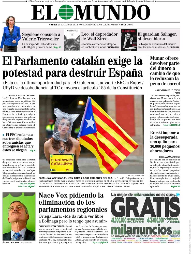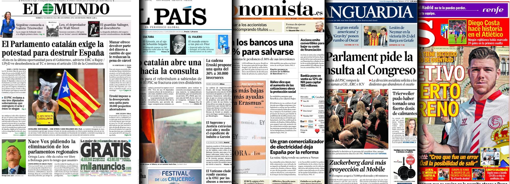 Portadas de los diarios El Mundo, El País, ABC, La Razón, La Vanguardia, El Periódico, Cinco Días, El Economista, Expansión, Marca, As, Mundo Deportivo y Sport.