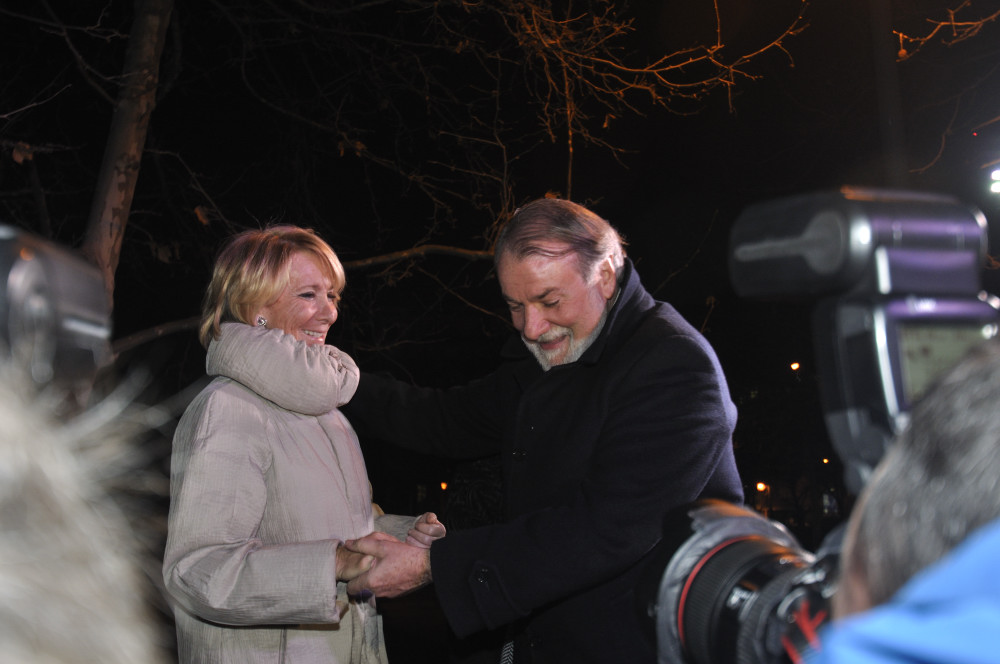 Un momento durante el acto en el que se daban la mano Esperanza Aguirre y Jaime Mayor Oreja.