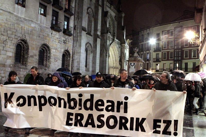 Los manifestantes, entre los que figuraba el veterano del entorno proetarra, Tasio Erkizia, han recorrido el Casco Viejo de Bilbao bajo la lluvia sin portar fotografías de presos de ETA, ni aludir directamente a la banda terrorista en los lemas coreados. Durante el recorrido, los lemas, en euskera, que se han oído son los de "Aitziber, Arantza libres", "La represión no es el camino", "Presos vascos a casa", "Detenidos, libertad" o "Aitziber, Arantza, os queremos".
