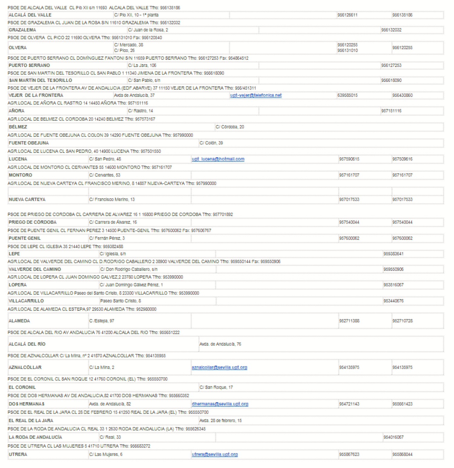 A continuación mostramos la relación de sedes compartidas por PSOE y UGT en Andalucía. Teniendo en cuenta que el PSOE no revela siempre la dirección de sus sedes, a pesar de que en sus documentos oficiales y en su web hay un apartado para sedes. Los siguientes datos, buscados y ordenados por Libertad Digital, proceden de las webs de PSOE y UGT. Arriba, la dirección de la sede del PSOE en la localidad. En negritas, inmediatamente abajo, la sede donde se ubica UGT. Anotamos las coincidencias en calles, números, casas contiguas e incluso teléfonos comunes.