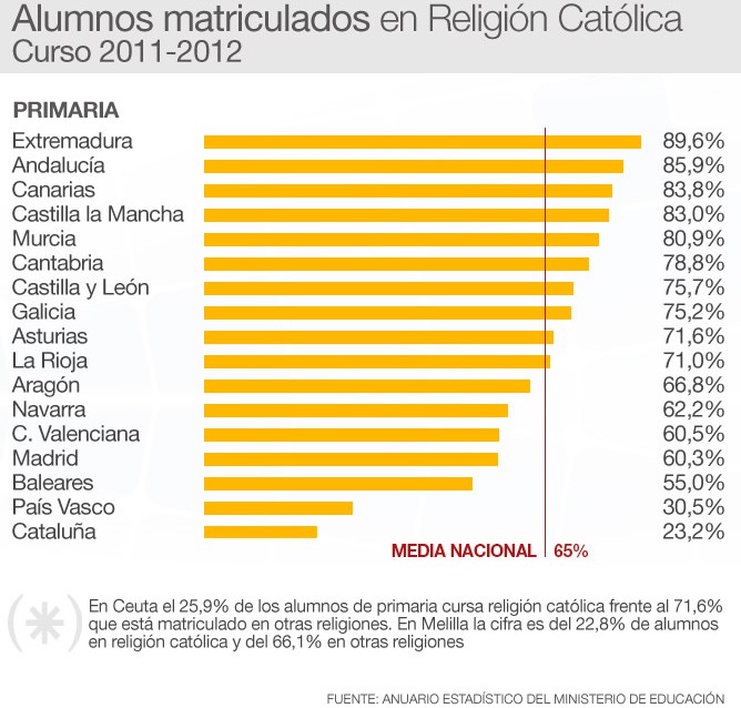 Sin embargo, en este caso, también Cataluña y País Vasco desentonan de manera notable con el resto de comunidades. Según los datos facilitados por Educación para el curso 2011-2012, en Cataluña cursaron clase de Religión Católica en Primaria el 23,2% de los alumnos por el 30,5% del País Vasco. Los siguientes en la lista serían Baleares con el 55% y Madrid con el 60. El salto con el resto es enorme y más si se comparan con las comunidades que encabezan la lista, con Extremadura con casi el 90% de sus alumnos matriculados o el 86 de los andaluces.
