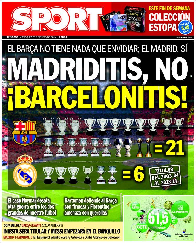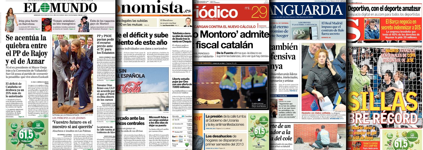 Portadas de los diarios El Mundo, El País, ABC, La Razón, La Vanguardia, El Periódico, Cinco Días, El Economista, Expansión, Marca, As, Mundo Deportivo y Sport.