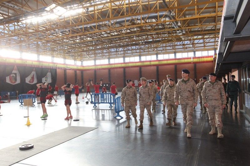 El Príncipe de Asturias, en el gimnasio de la Brigada Paracaidista, conoce los medios y circuitos de fuerza para el entrenamiento de los paracaidistas.