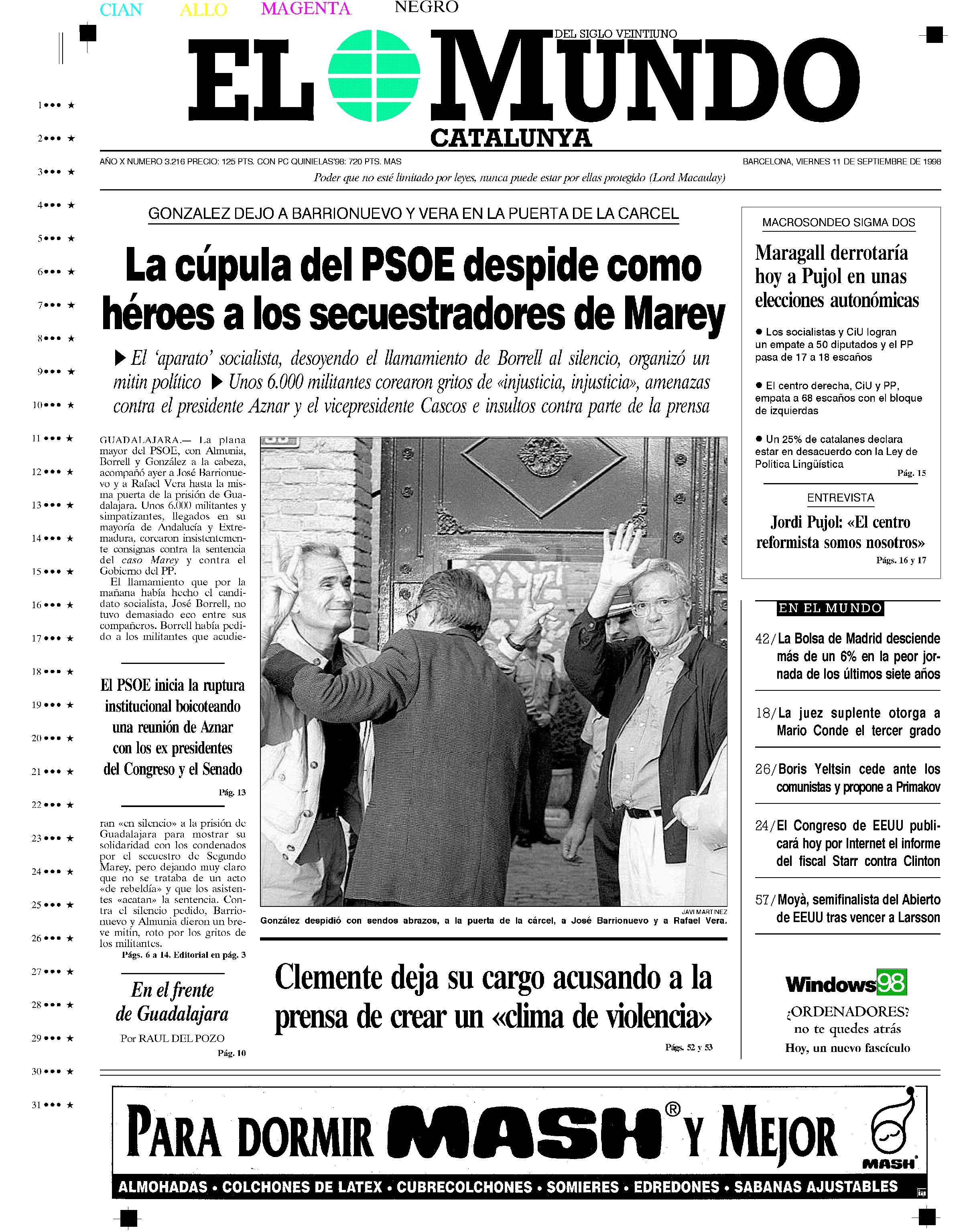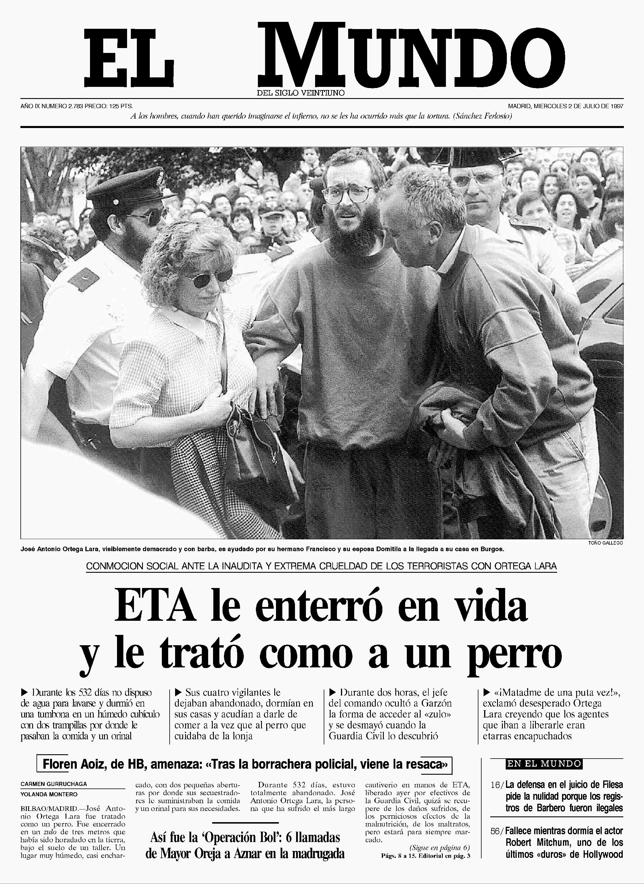 La Guardia Civil libera a José Antonio Ortega Lara después de 532 días enterrado en vida. "ETA le enterró en vida y le trató como a un perro", titulaba el diario El Mundo aquel 2 de julio del 97.