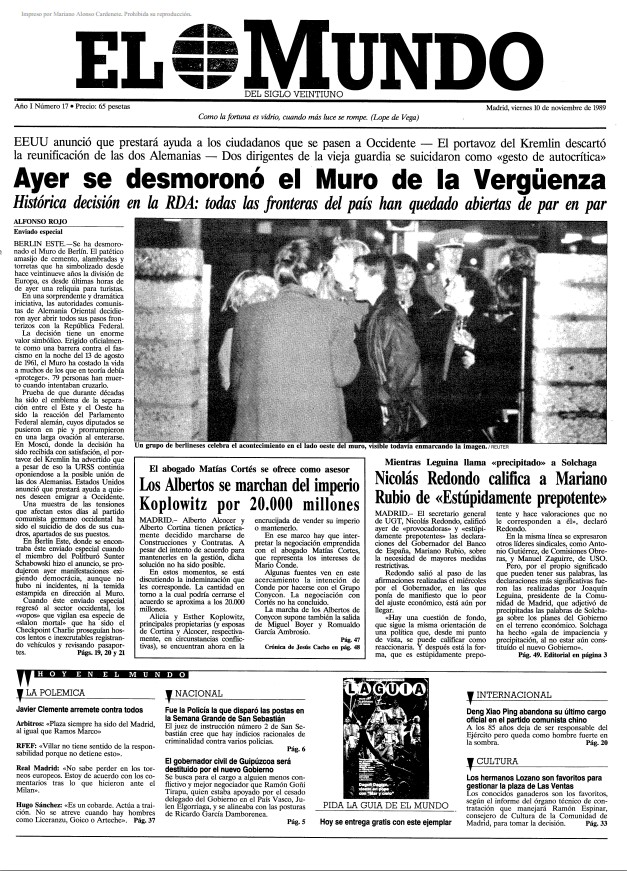 El Mundo, recién nacido, daba cuenta del fin del telón de acero: "Ayer se desmoronó el Muro de la Vergüenza", titulaba a cinco columnas el diario de Pedro J. Ramírez.