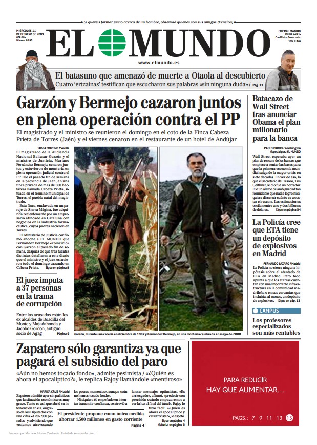 El diario El Mundo publica en su portada que el juez Garzón y el ministro de Justicia, Fernández Bermejo, cazaron juntos en plena operación contra el PP. Una información que terminaría provocando la dimisión de Bermejo.