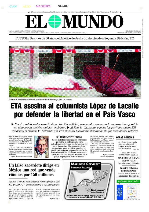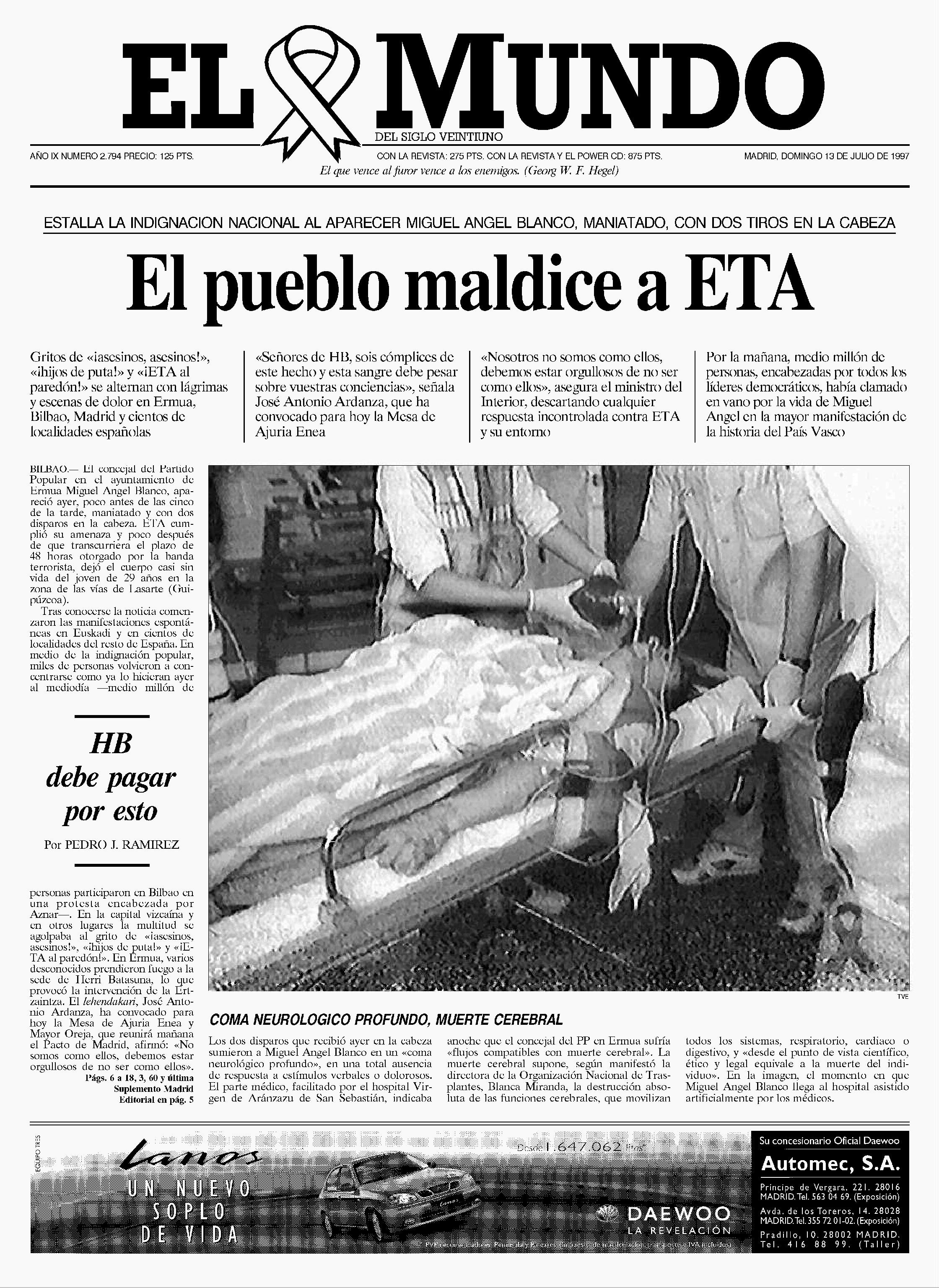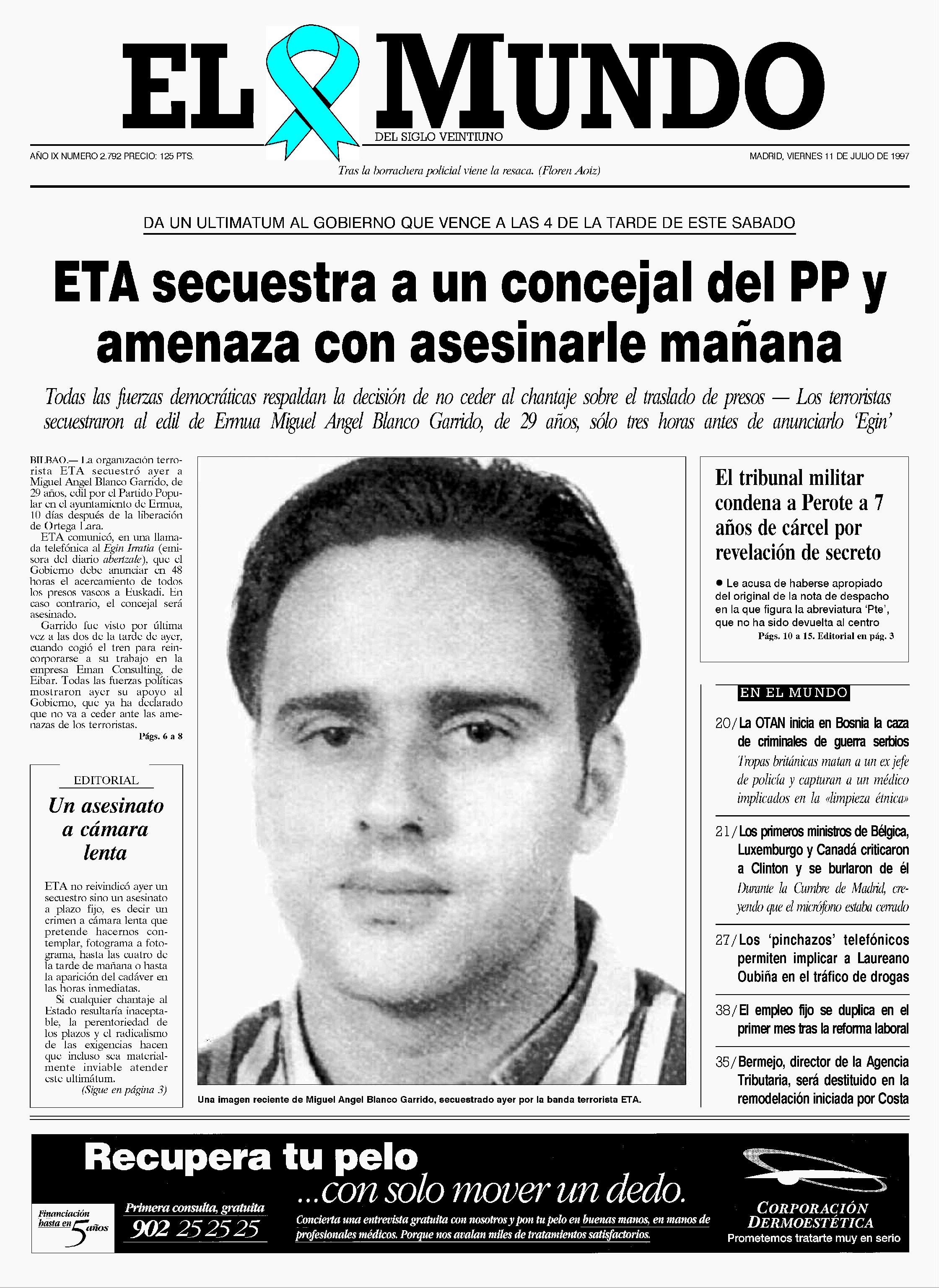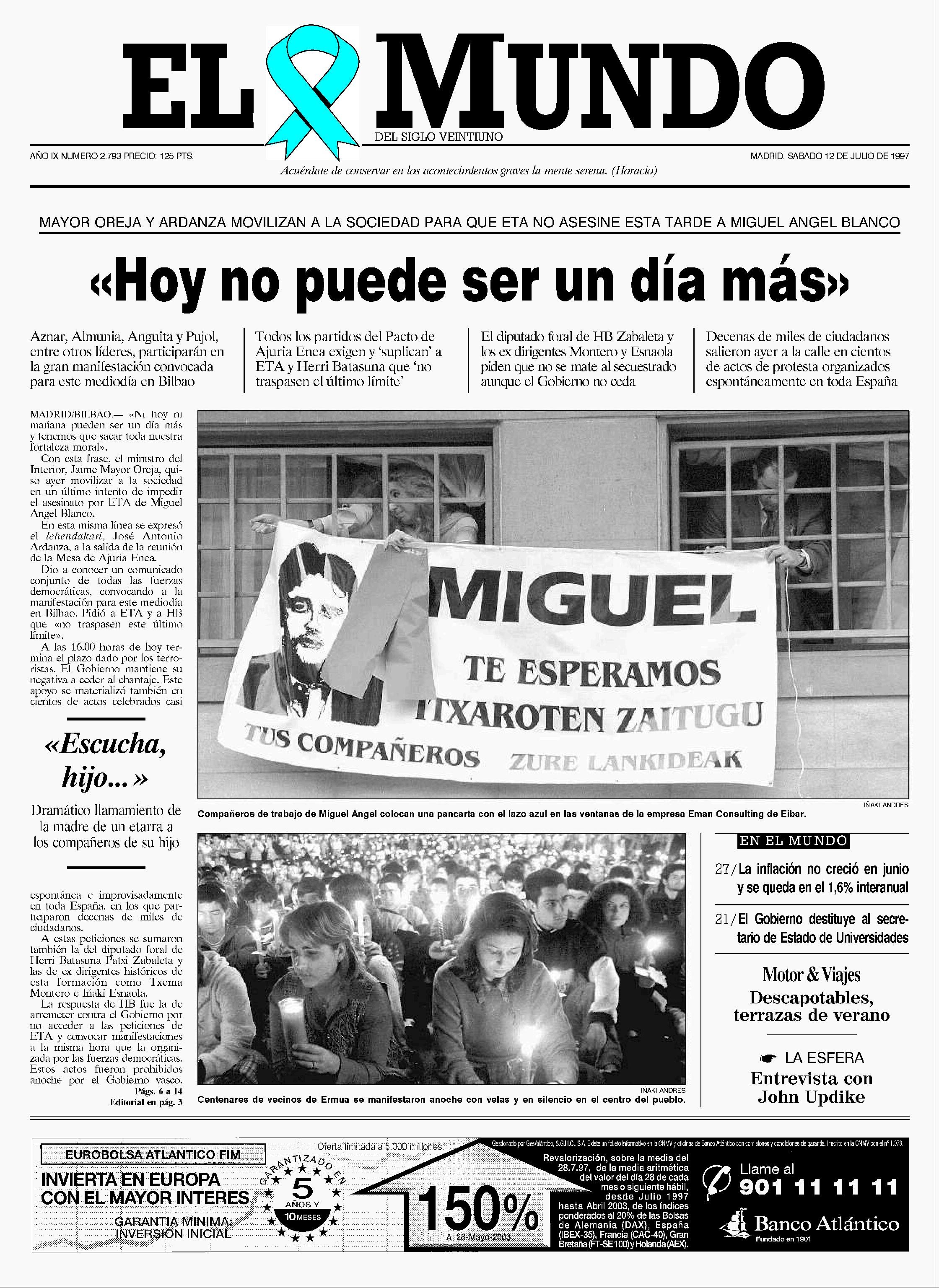 El mismo día del asesinato de Miguel Ángel Blanco, El Mundo abría su edición con un llamamiento de Mayor Oreja y Ardanza: "Hoy no puede ser un día más".