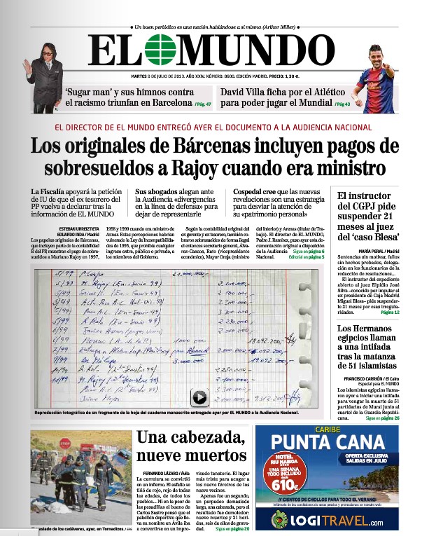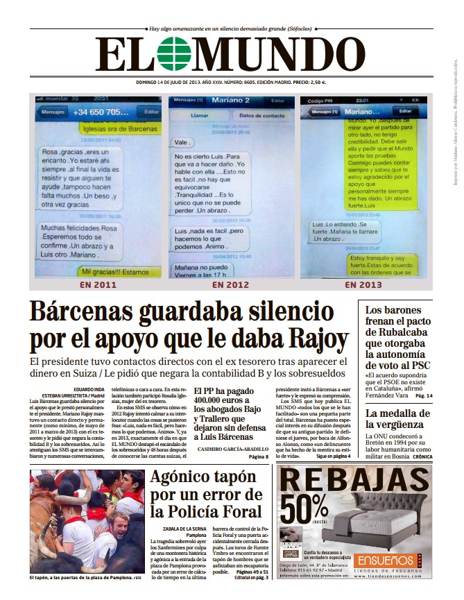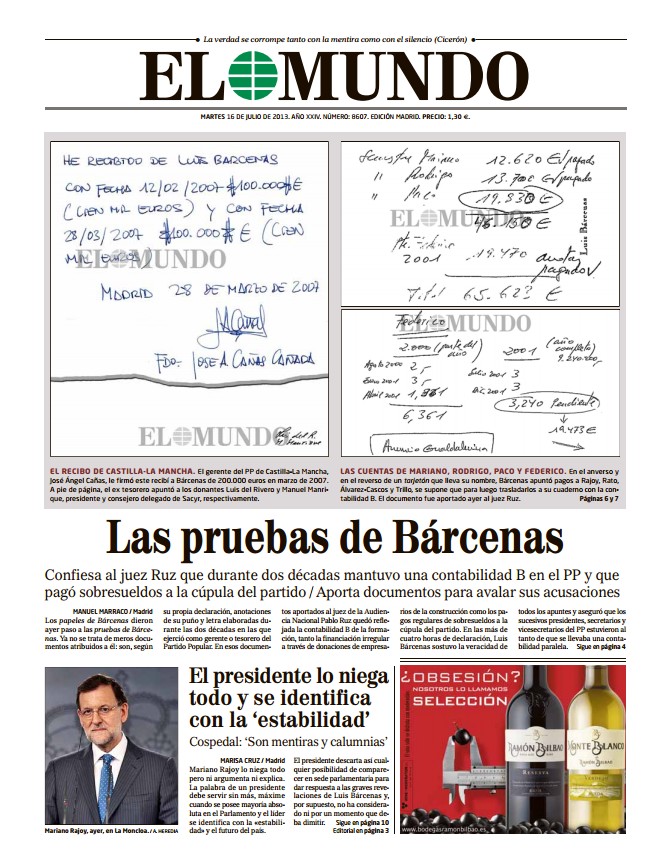 El diario El Mundo destacaba que "los originales de Bárcenas incluyen pagos de sobresueldos a Rajoy cuando era ministro".