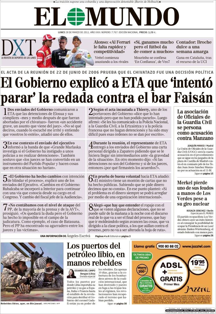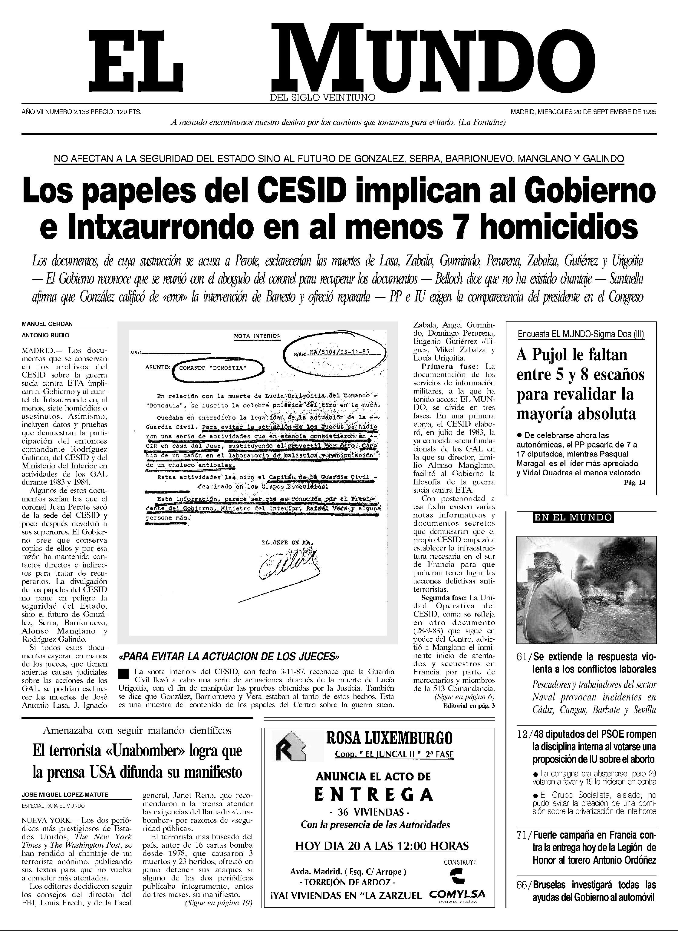 El diario El Mundo desvelaba que "los papeles del CESID implican al Gobierno e Intxaurrondo en al menos 7 homicidios".